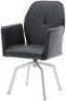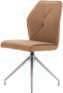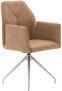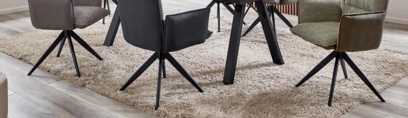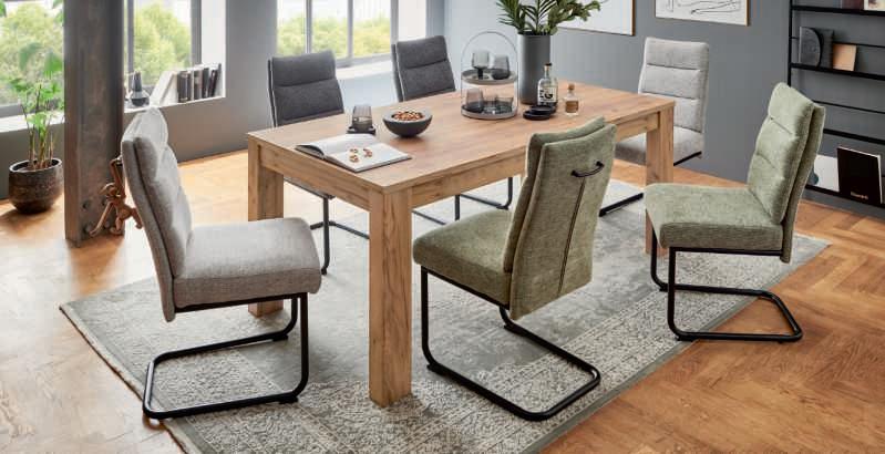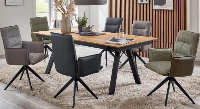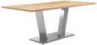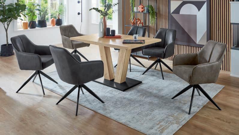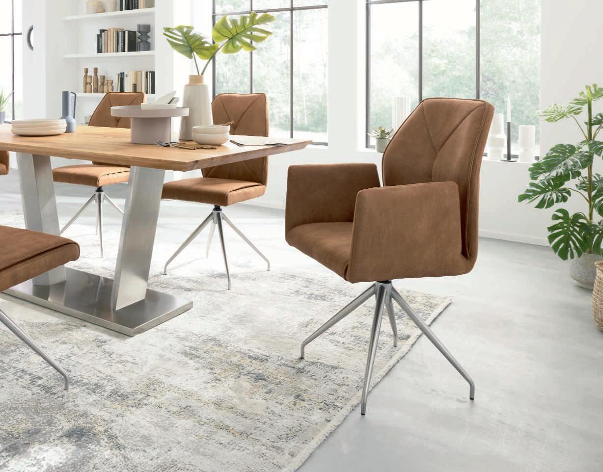 7I Esstisch, Platte Wildeiche hell massiv geölt mit Schweizer Kante, Gestell Edelstahl, ca. 200x100 cm. 8I Armlehnstuhl und 9I Polsterstuhl, Bezug Mikrofaser Amber bernstein, Gestell Edelstahl, mit Dreh- und Rückstellfunktion, Sitzschale ZILM/ZILMA mit Griff im Rücken, Bezug: 100% Polyester, Armlehnstuhl zusätzlich mit Motion-Funktion. M955406 200 369 6762