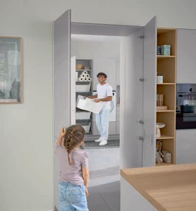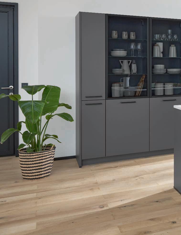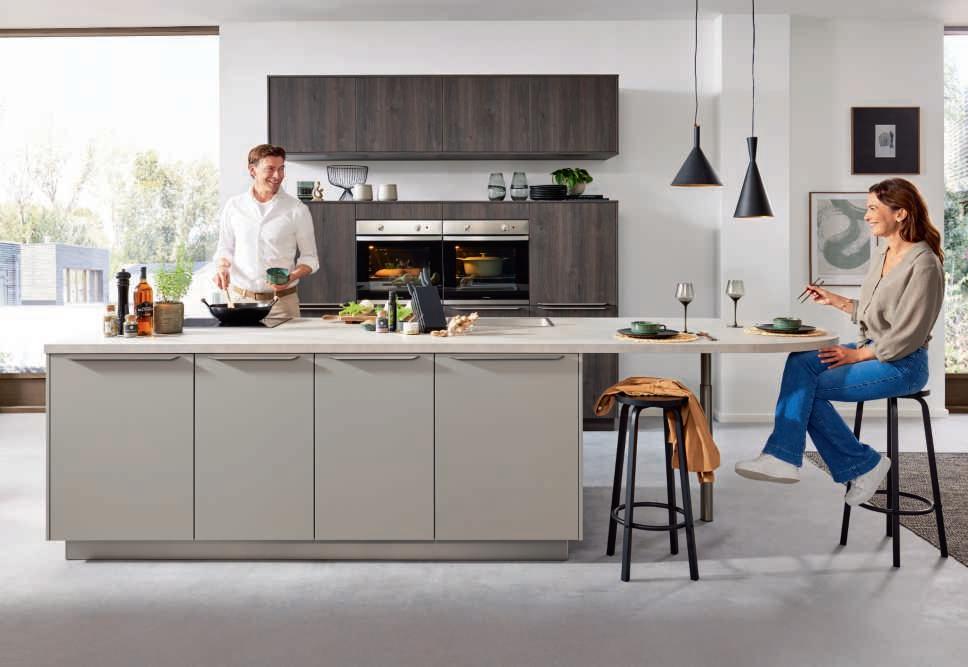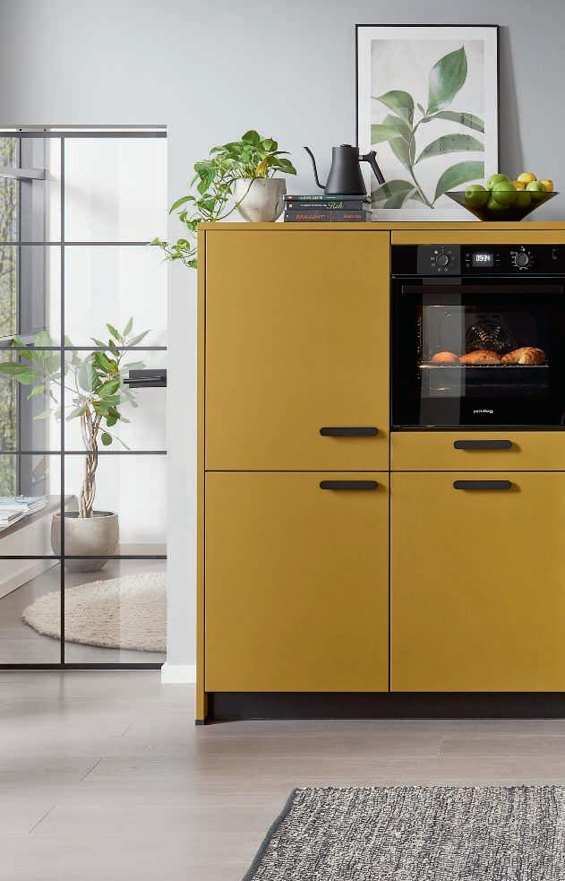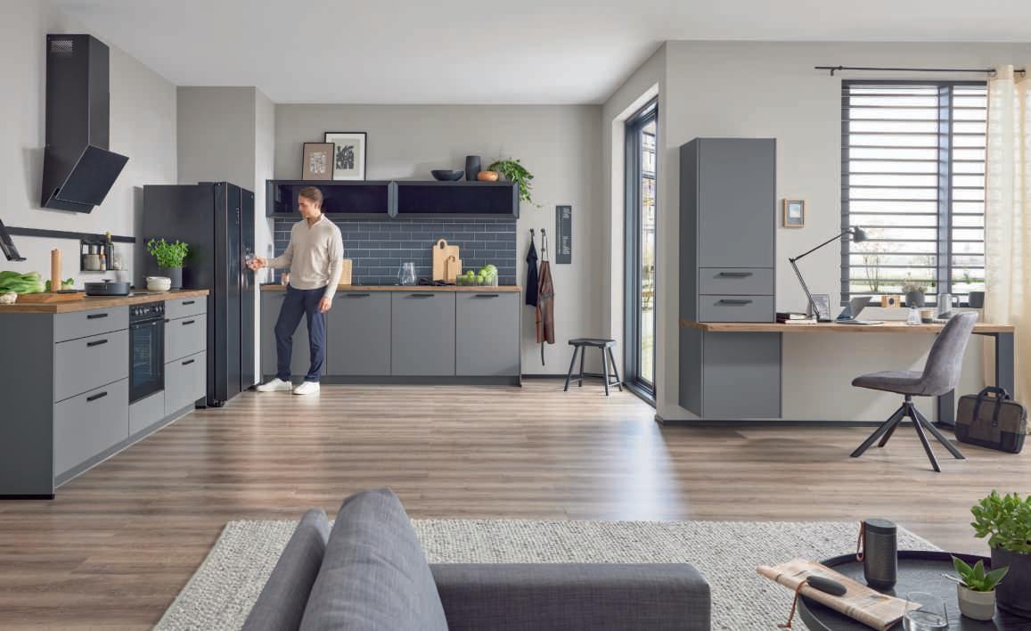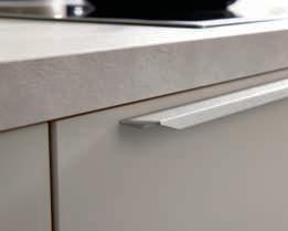 Elegante Fronten mit edelstahlfarbigen Griffleisten unterstreichen das hochwertige Design.