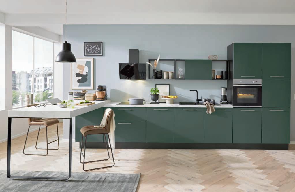 Interliving Küche Serie 3059 im Programm 3150, Front im Farbton black green, Korpus quarzgrau, Arbeitsplatte und Ansetztisch Marmor weiß Nachbildung, best. aus Zeile mit Hängern, schwarzen Metallregalen und Ansetztisch. Ausgestattet mit hochwertigen Privileg-Elektrogeräten, Einbauspüle und Armatur. Maße ca. 220x480 cm.