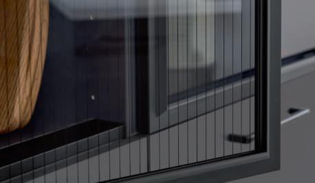 Die exklusiven Glastüren in Parsolglas Black Lines mit Alurahmen und umlaufendem Griffprofil unterstreichen den wohnlichen Charakter.