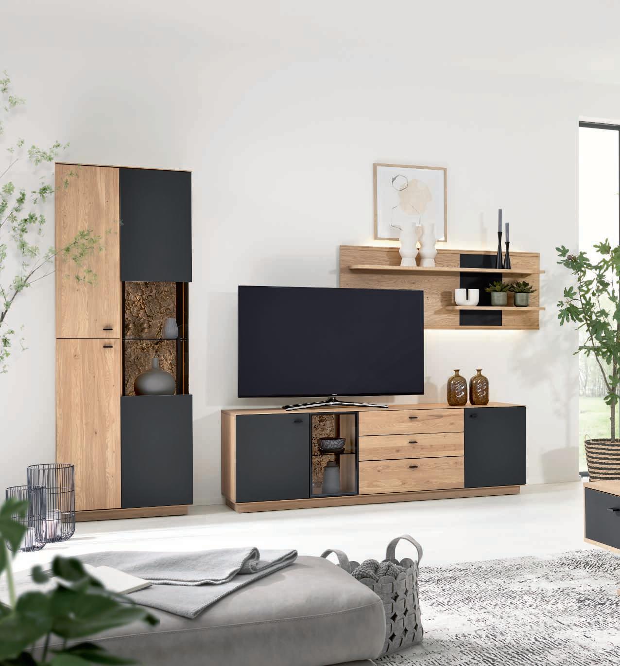Interliving Wohnzimmer Serie 2025, Front Wildeiche massiv, Korpus außen Wildeiche furniert, innen Wildeiche Nachbildung, Absetzungen Echt-Kork/ Glas anthrazit, Satin matt. 1I Wohnkombination, best. aus Vitrine, Lowboard und Wandpaneel, ca. B325/ H209/T50 cm, 2I Highboard, ca. B116/ H144/T40 cm, 3I Couchtisch, Platte Wildeiche massiv, 3 offene Fächer, 1 Schubkasten, ca. B115/H46/T65 cm. 4I Sideboard, ca. B175/H87/T50 cm.