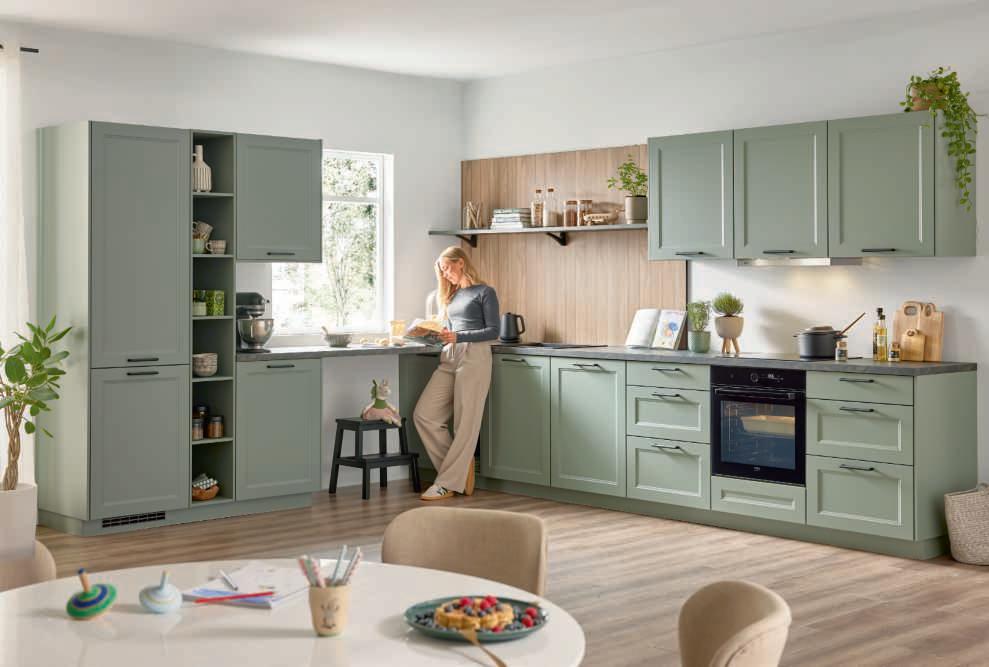 Culineo Küche im Programm C684, Front Lacklaminat schilf, Nischenrückwand Wandpaneel Eiche Sierra Nachbildung, Arbeitsplatten und Regalboard Quarzit grün Nachbildung. Best. aus Hochschrank-Element mit Regalteil, Zeile mit Hängern und verbindender Arbeitsplatte. Mit hochwertigen Elektrogeräten und Einbauspüle. Maße ca. 380 + 150 cm. Ohne Deko. M483132 206 408 8680