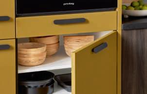 Die Farbkombination aus dunkler Holzoptik und dem sonnigen Olivegelb wirkt sehr erfrischend.