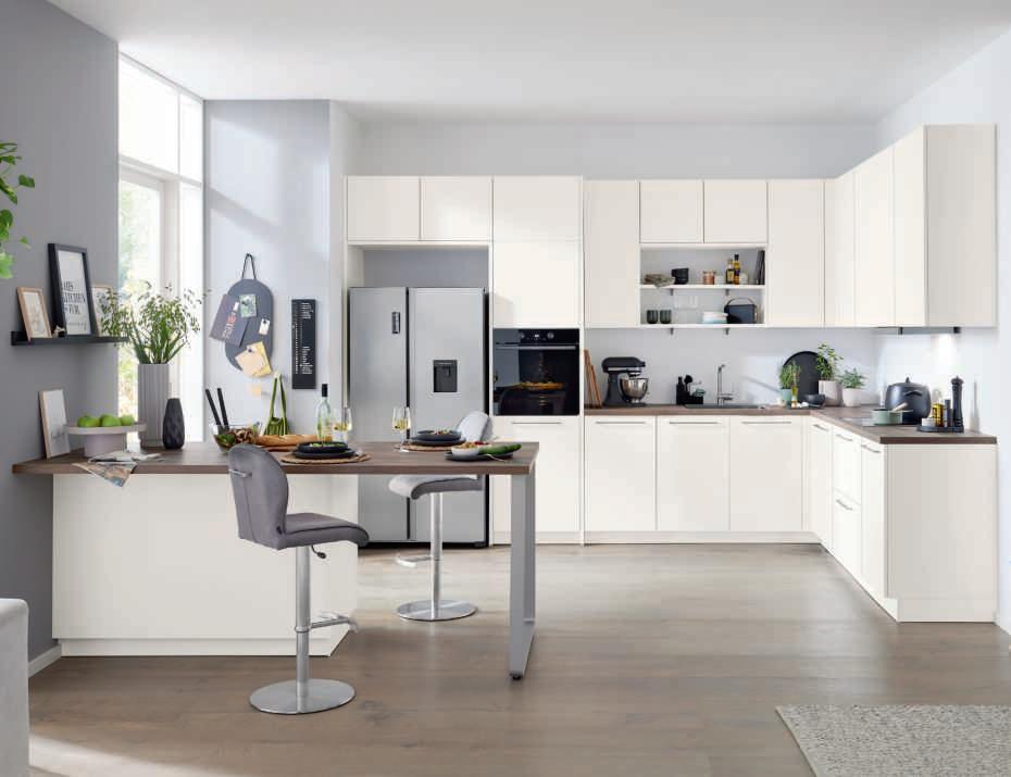 Interliving Küche Serie 3090 im Programm 3110, Front und Korpus magnolia, Arbeitsplatten und Ansetztisch Castell Eiche Nachbildung. Best. aus L-Küche mit Hängern, Regalteil und Insel mit Ansetztisch. Ausgestattet mit Gorenje-Elektrogeräten inkl. großer Side-by-Side Kühl-/Gefrierkombi, Einbauspüle und Armatur. Maße ca. 380x255 + 220 cm. Ohne Deko. M997213
