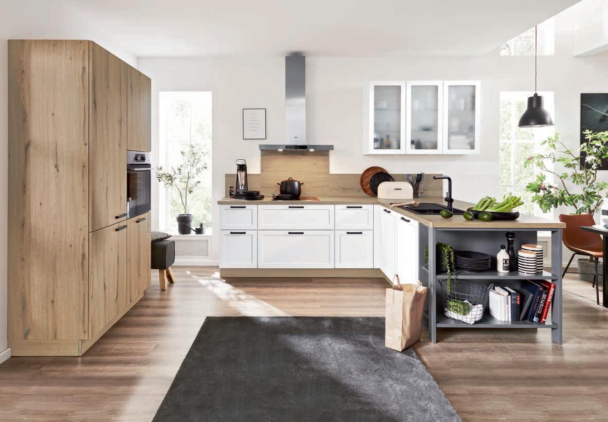 Interliving Küche Serie 3029 im Programm 3380, Front 3D-Lacklaminat weiß matt und Vulkaneiche Nachbildung, Arbeitsplatten und Nischenrückwand Vulkaneiche Nachbildung, best. aus Hochschrankelement, Glashängern und Küchenzeile in L-Form mit exklusivem, quarzgrauem Abschlussregal. Ausgestattet mit hochwertigen AEG-Elektrogeräten und Einbauspüle mit Armatur. Maße ca. 120 + 318x217 cm. M997213 018 364 7680