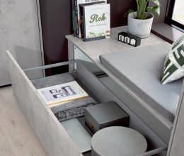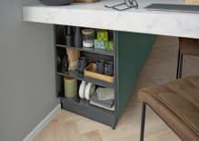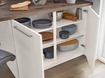 Zahlreiche praktische Auszüge sorgen für Ordnung und Übersicht. Der Innenauszug verbirgt sich hinter der hohen Schubkastenfront.