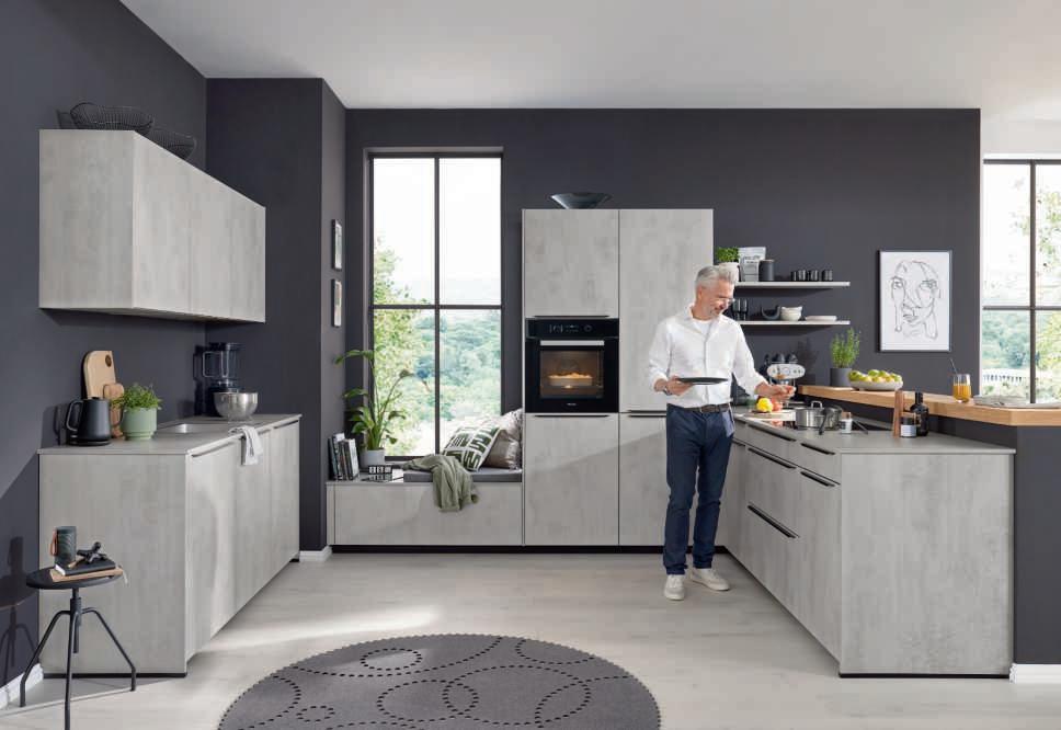 WERT-KÜCHE aus dem Programm Ella, Front, Wangen, Wandboards und Arbeitsplatten Beton quarzgrau Nachbildung, Griffleisten onyxschwarz, best. aus L-Küche mit Hochschrank und separater Zeile aus Unterschränken und Hängern. Mit Elektrogeräten von Miele und Einbauspüle. Maße ca. 310x257 + 180 cm. Ohne Deko. M880803 213 392 3705