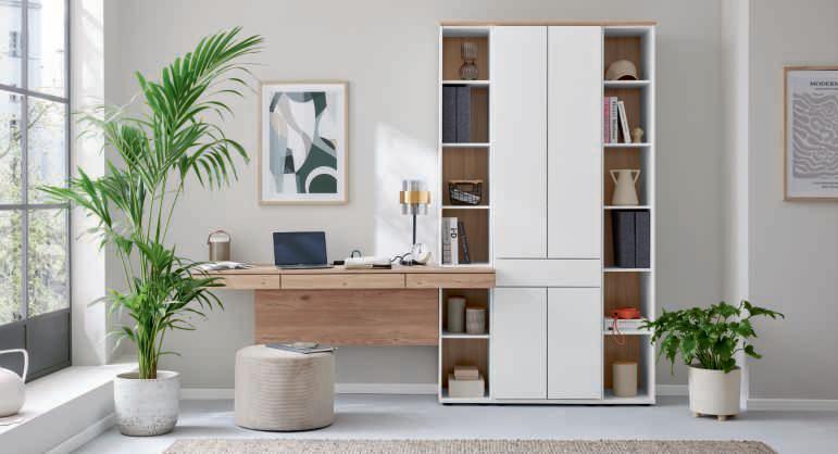 Interliving Wohnzimmer Serie 2031 - RegalSchreibtischkombination, Front und Korpus tonweiß matt, Rückwand, Schreibtisch und Abdeckblatt Risseiche Nachbildung, ca. B225/H215/T40-60 cm. M930032 002 401 1212 2599.-