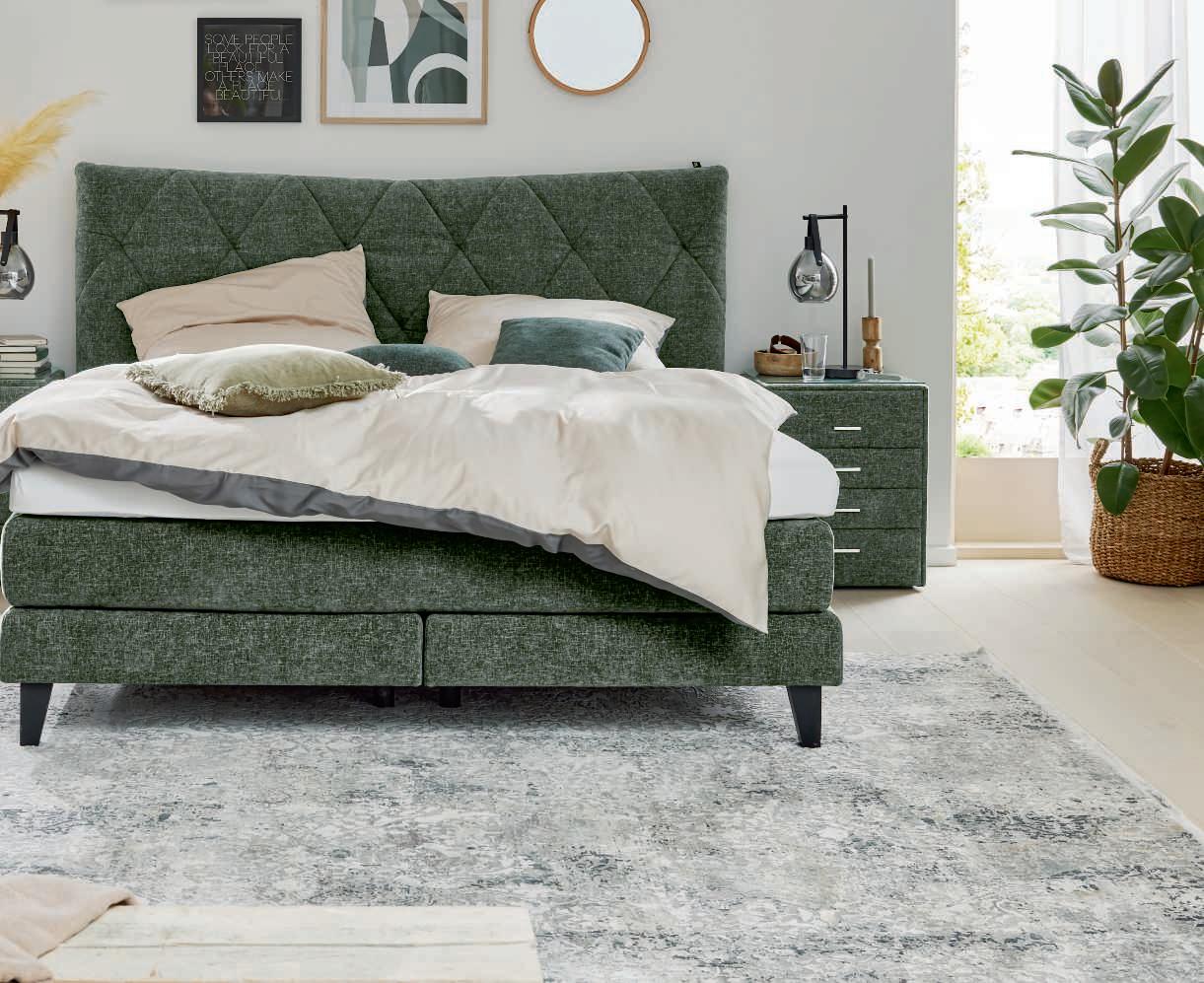 Gestalte mich nach deinen Wünschen – ich bin ein Boxspringbett mit vielen Gesichtern: Stelle dir aus 5 Kopfteilen, 2 Unterbauten, 3 stoffbezogenen Matratzen und 9 Fußvarianten einfach dein Traumbett zusammen!