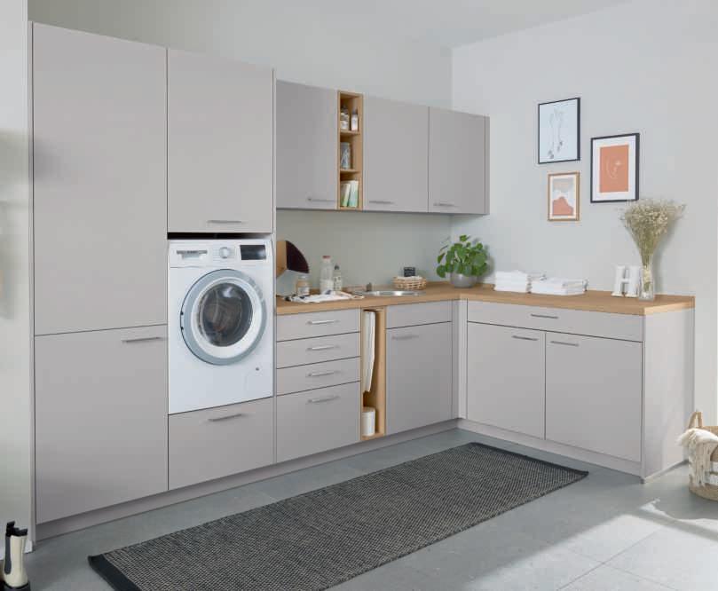 Culineo Hauswirtschaftsraum im Programm C615, Front und Korpus seidengrau, Arbeitsplatte und Nischenregale Eiche Como Nachbildung. Best. aus L-Form mit Hoch- und Hängeschränken. Mit Einbauspüle. Maße ca. 328x187 cm. Ohne Waschmaschine und Deko. M483132 014 403 8626