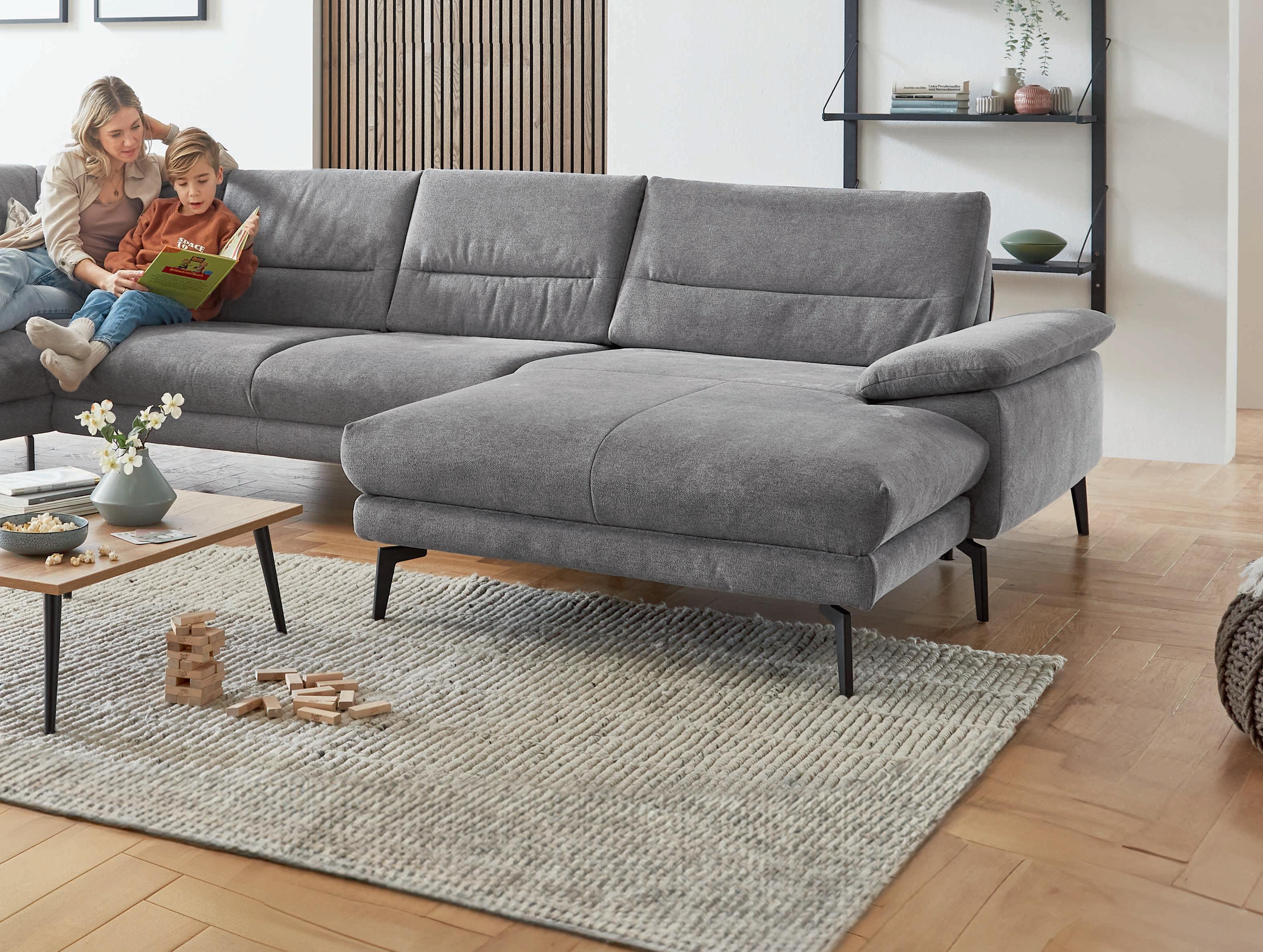 Eckkombination MM-ZE1080, Bezug Stoff Unica steel, Metallfuß schwarz, best. aus: 2,5-Sitzer mit Armteil links und Canapé mit Armteil rechts. Stellmaß ca. 232x168 cm.