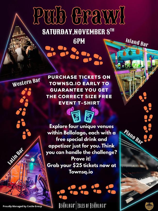 This will be a night you won’t want to miss! Our second annual Pub Crawl event at Bellalago! Explore four unique themed venues, each with a free special drink and appetizer just for you. (If you would like a different drink from the special drink provided in each of the venues, you can purchase another drink at the bar at Flip Flops.) Each group will have up to 20 residents and you will spend 30 minutes in each venue then travel with your staff leader to each of the four venues until you complete the Pub Crawl! The four venues include: Recreation Center - Latin Bar; Recreation Center Parking Lot - Caribbean Bar;