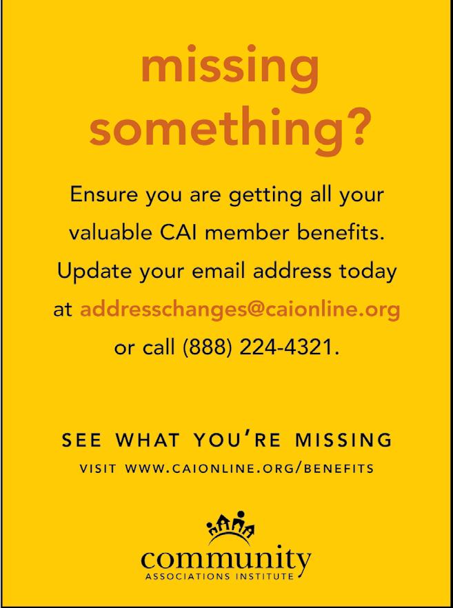 This publication attempts to provide CAI’s membership with information on community association issues. Authors are responsible for developing the logic of their expressed opinions and for the authenticity of all presented facts in articles. CAI does not endorse or approve statements of fact or opinion made in these pages and assumes no responsibility for those statements. This publication is issued with the understanding that the publisher is not engaged in rendering legal, accounting or other professional services. If legal advice or other expert assistance is required, the services of a competent professional should be sought.