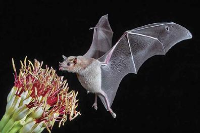 Did you know bats make great neighbors? Bats are the only flying mammal in the world—and they’re fantastic neighbors! These nighttime flyers can eat hundreds of mosquitoes in an hour and often swoop through backyards, over ponds, or near streetlights at dusk. With more than 40 bat species in the U.S., you might spot a few outside your doorstep. Want to help local wildlife like these pollinators thrive? Try adding a bat house to your yard! For wildlife and bat watching tips, visit thegreenhour.org/activity/watch-a-bat-ballet. The photo is a native species of bat called the lesser long-nosed bat. Photo credit: Sandra Rothenberg.