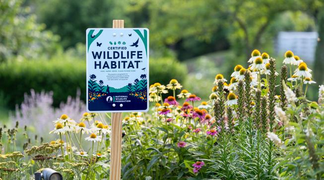 Planting native plants in your garden is a simple way to create a thriving habitat for birds, pollinators, and countless other wildlife. Learn how to get your garden recognized as a Certified Wildlife Habitat® with the National Wildlife Federation. When you certify, the $25 application fee provides: A personalized paper certificate; A 1-year NWF membership and subscription to National Wildlife® magazine; Subscription to our monthly Garden for Wildlife® Habitats e-newsletter; Exclusive option to purchase garden signs. Through June 30, use code GARDEN20 to receive 20% off your certification fee and habitat sign. Visit certifiedwildlifehabitat. nwf.org or scan the QR code.