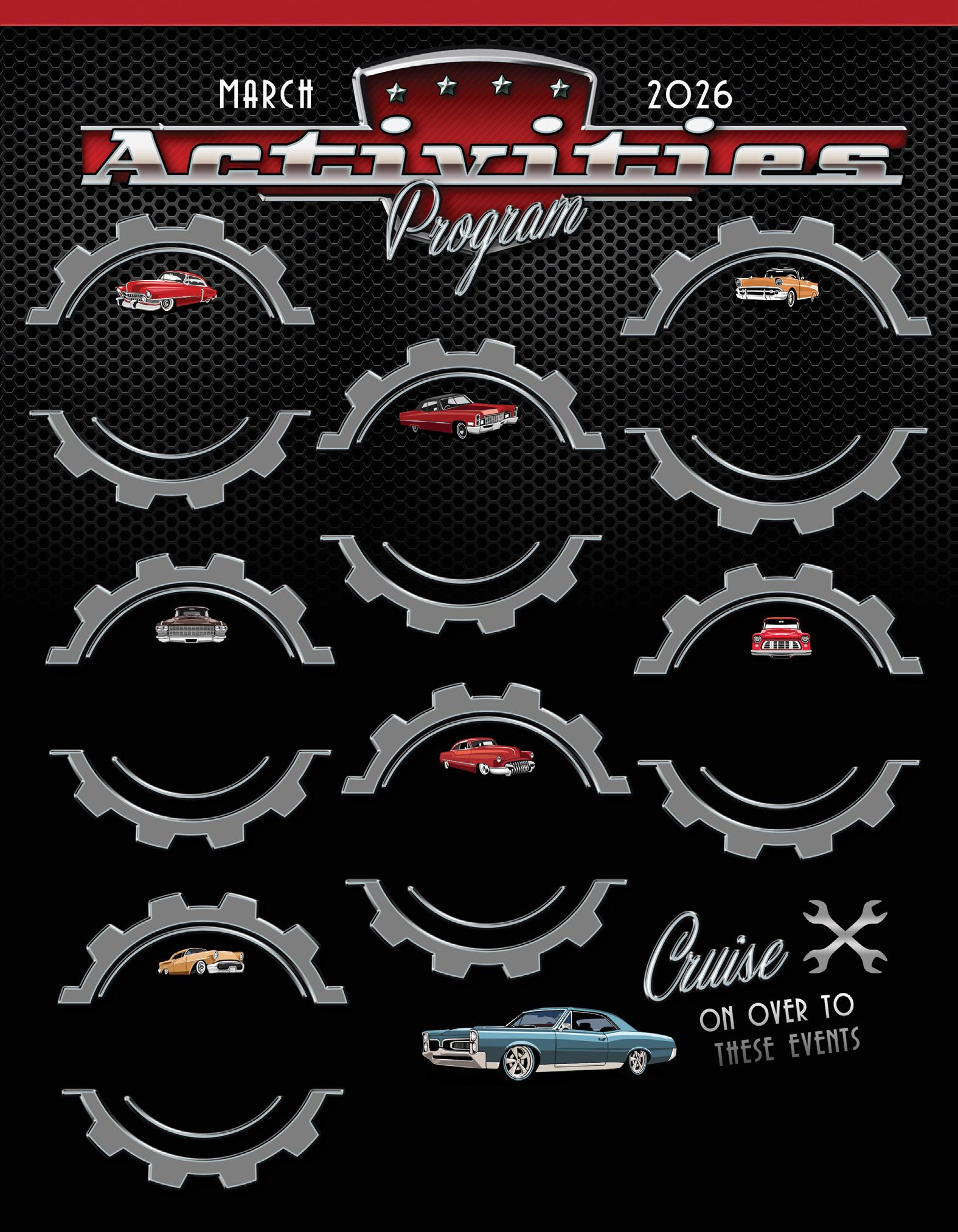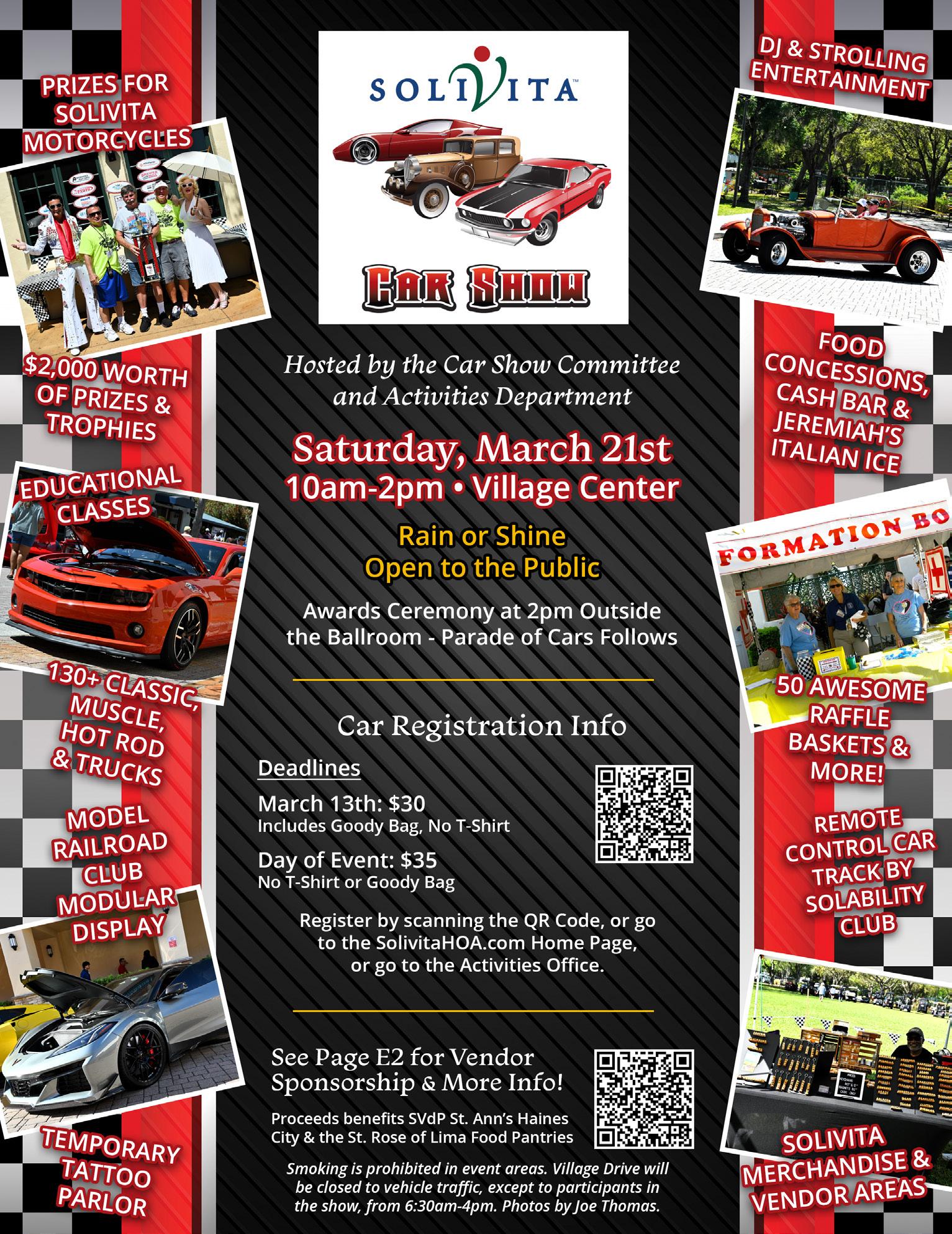 Saturday, March 21st: Solivita Car Show - Event 10am3pm. VILLAGE DRIVE FROM THE BALLROOM TO THE PRO SHOP ROUNDABOUT IS CLOSED TO VEHICLES FROM 6:30AM-4PM, EXCEPT TO CAR SHOW PARTICIPANTS. See page E2 for event information.