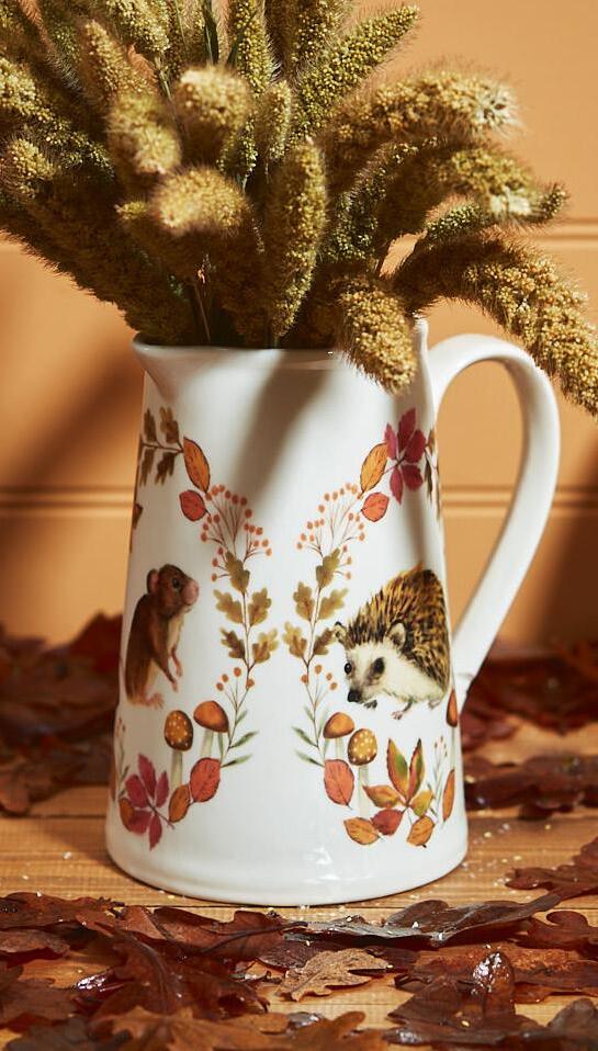 A handsomely decorated jug painted with a hedgehog, mouse and rabbit design, detailed down to the last whisker and surrounded by seasonal mushrooms and leaves. The rich colours make this jug a real statement piece for displaying faux flowers or branches, and instantly add charm to your decor or breakfast table. Height 7” (18.5cms).