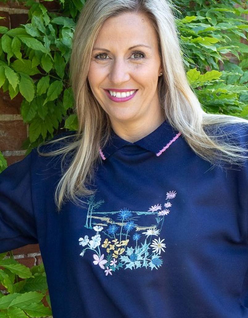 A new sweatshirt with snowdrops and everyone’s favourite chirpy chappie expertly embroidered onto a navy acrylic/cotton fleecy backed polyester mix jersey. With contrasting red knitted collar, it’s just right for the winter season.