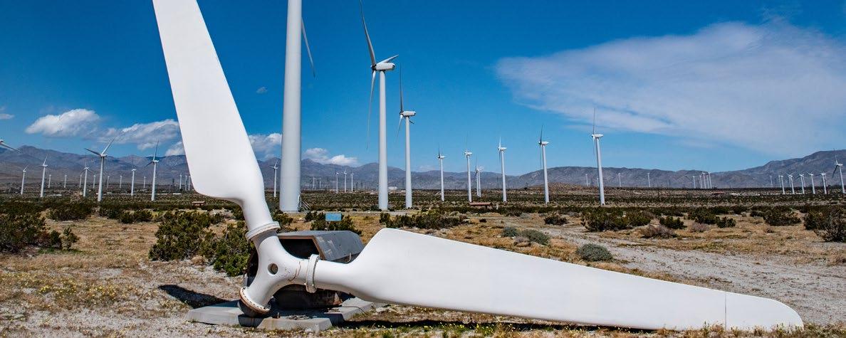Broken wind turbine blade in a field of wind turbines. © Frank Fennema