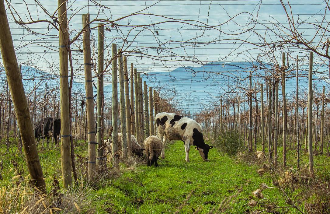 Schapen en koeien grazen tussen de wijnranken bij partner Red del Vino.