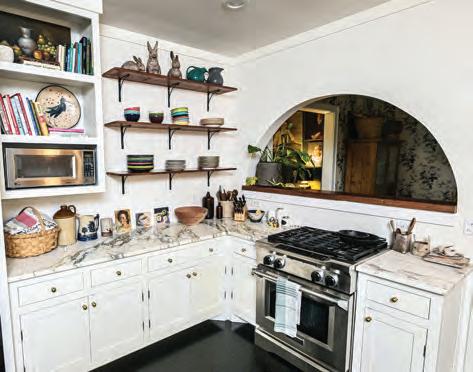 A custom arched pass-through and open shelving add warmth and character to this thoughtfully curated kitchen.