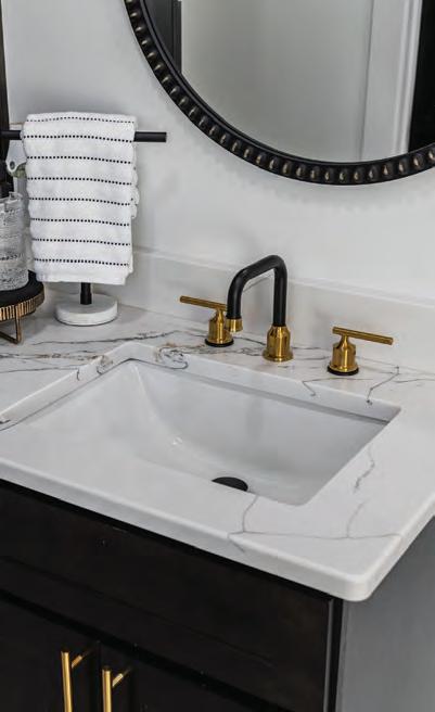 Their new living room, added in the 2023 addition, is a lightfilled room featuring great views of the backyard, but centers around custom-built-ins flanking a fireplace framed out with a vintage mantle. After a long search for the perfect mantle, Hayden knew she loved the shape of this one, but it was painted hot pink when she found it. She spent weeks stripping off layers of paint to reveal the treasure below. A cozy sherpa vintage sectional fills the room with comfortable seating, under a leggy, modern, but mid-century-inspired light fixture.