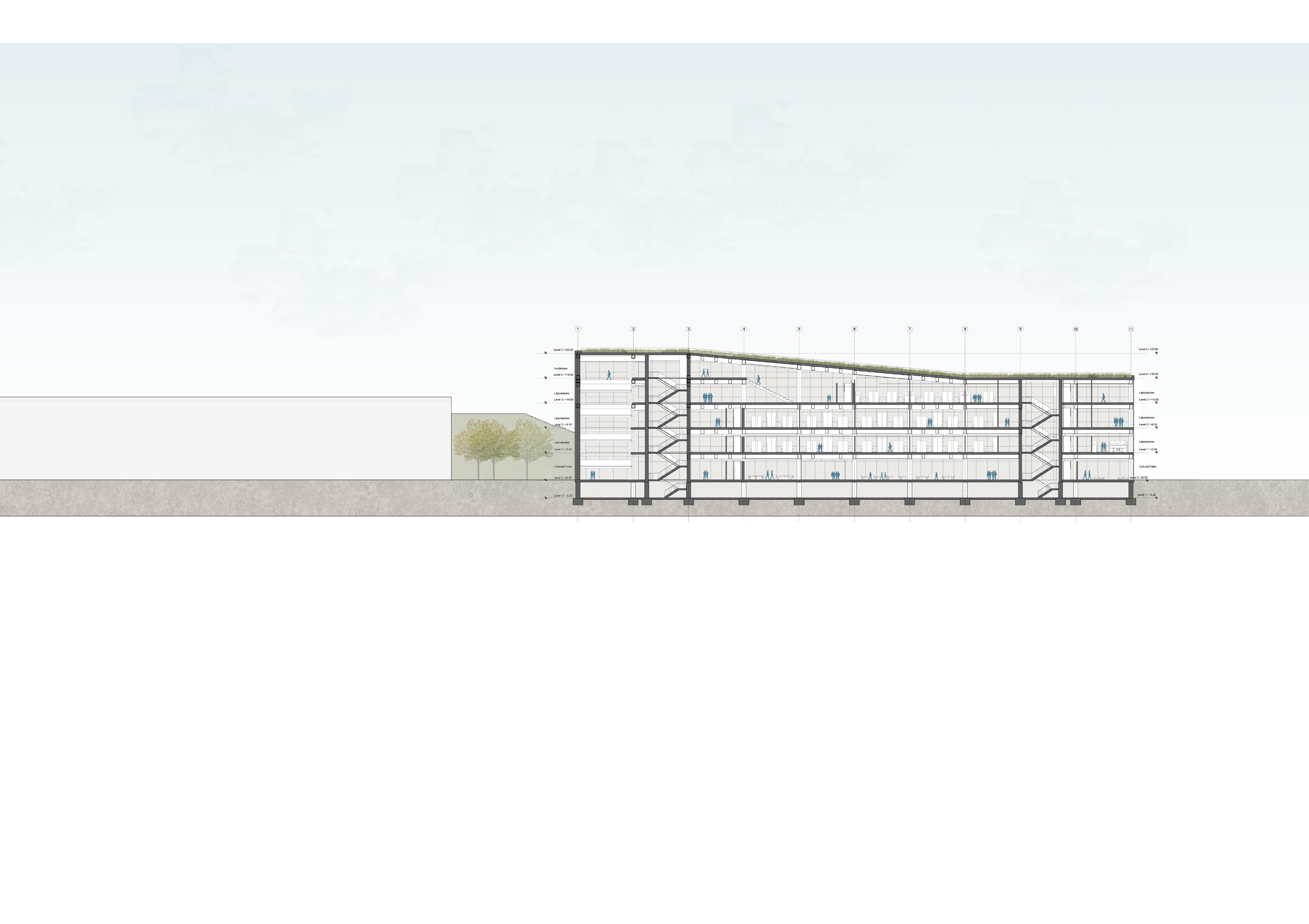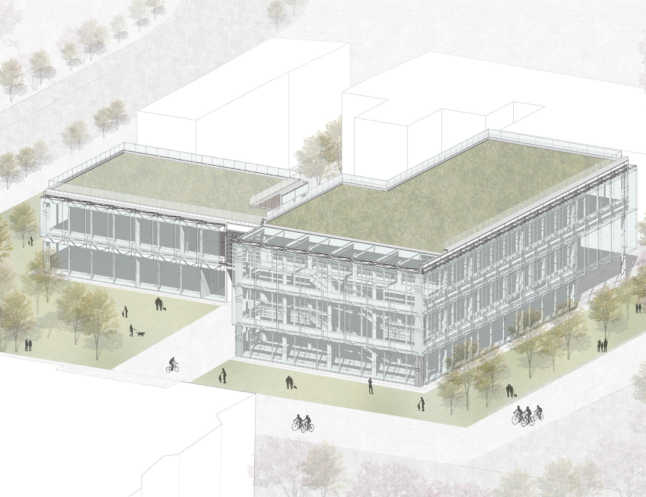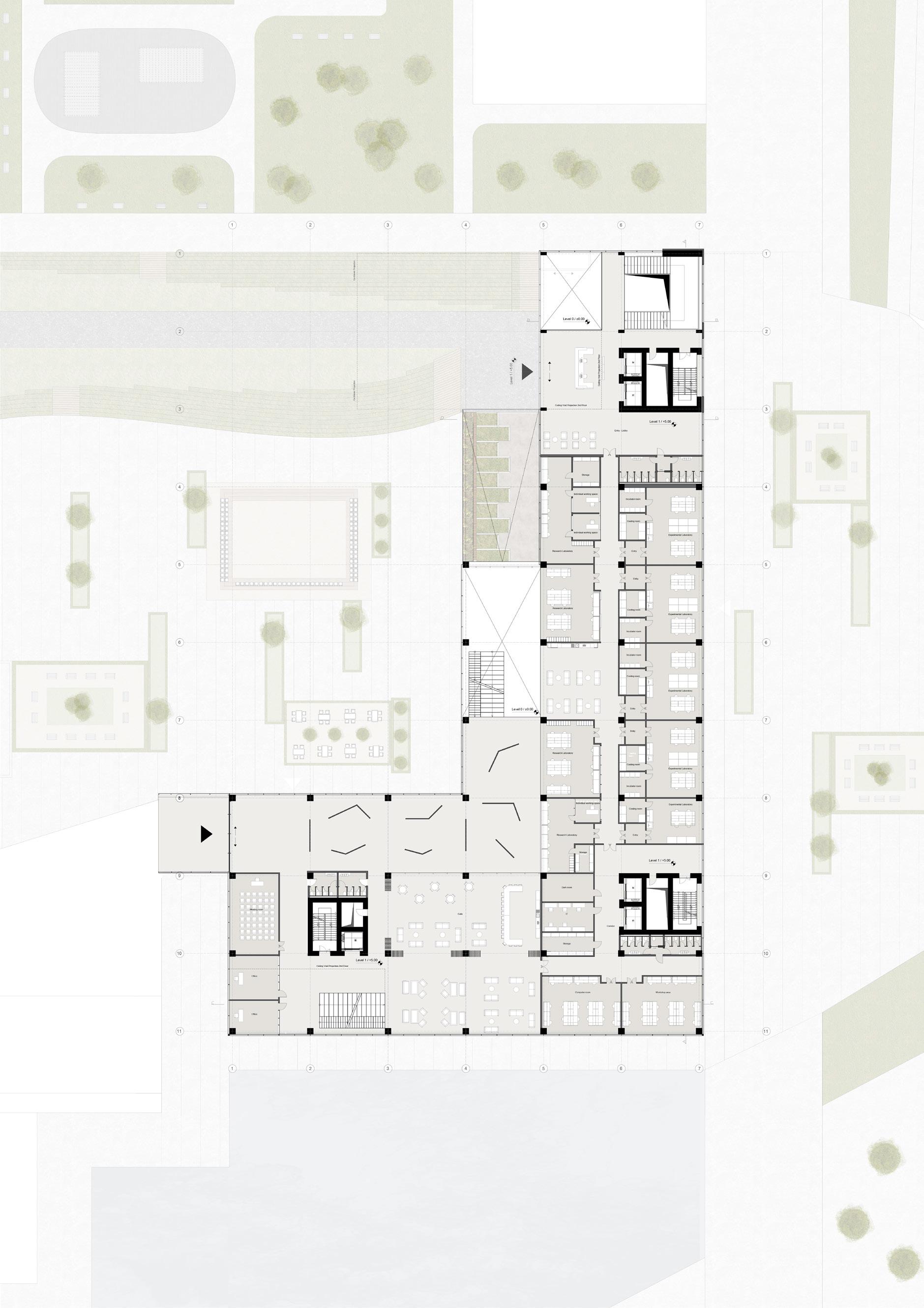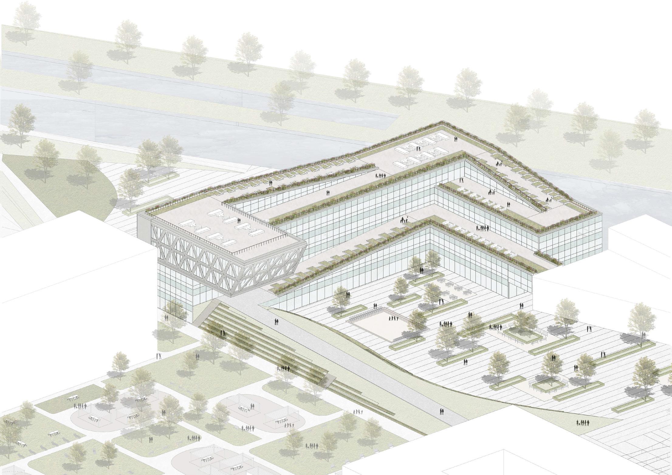 The Milano Innovation District hosted Expo 2015, today a center of knowledge and has established an ecosystem for social and economic development. The MIND’s backbone is called decuma no, a long artery that starts at the western gate and ends at the eastern one, where our project is located as an ending of the artery. Our starting point was to create a proper ending by re vitalizing the area with the green ramp and its master plan that transformed the area surrounding the new university campus into a park dedicated to sports and technology. The strategic location close to the new university and to the existing human technopole gave perfect ground for the development of a center dedicated to the research of natural science. The common ground (ground floor) is conceptualized as a translucent and flexible space, ful ly accessible by the public. In contrast, we designed the labo ratories in the above levels to feature a more enclosed design.