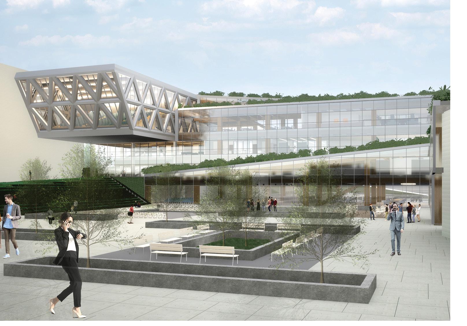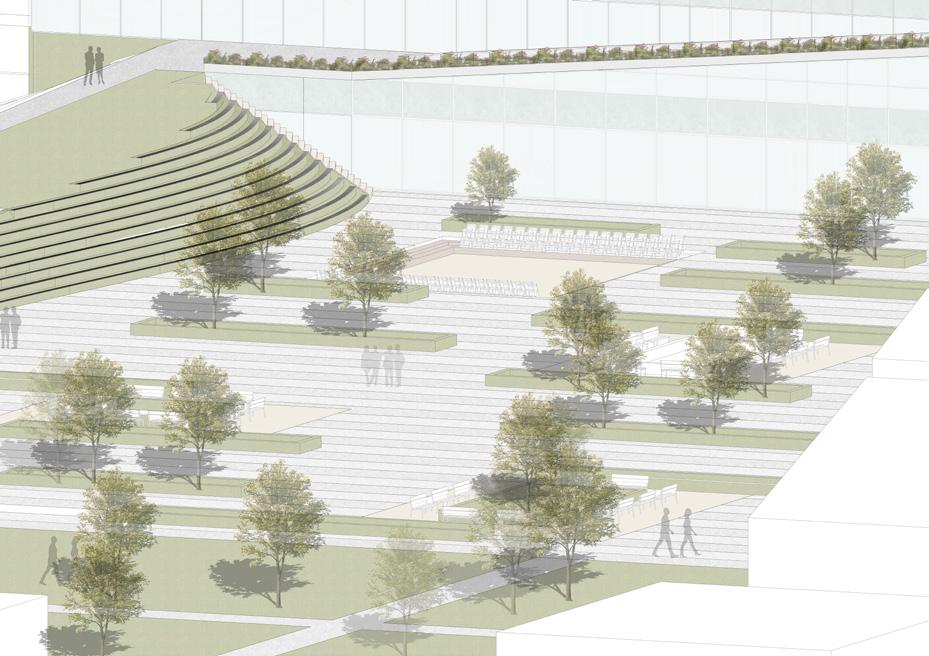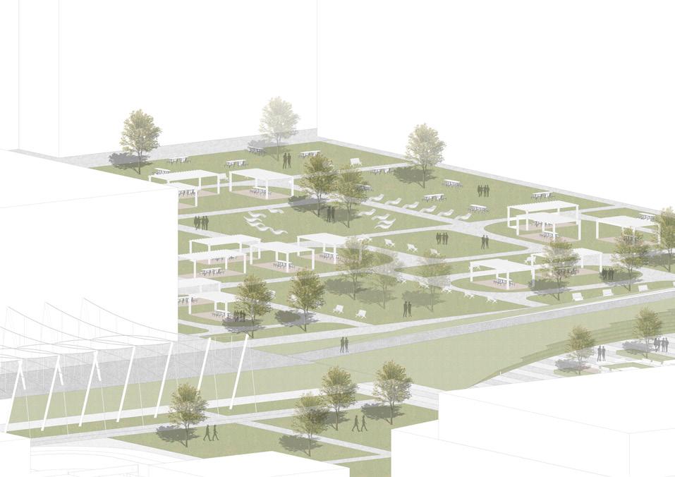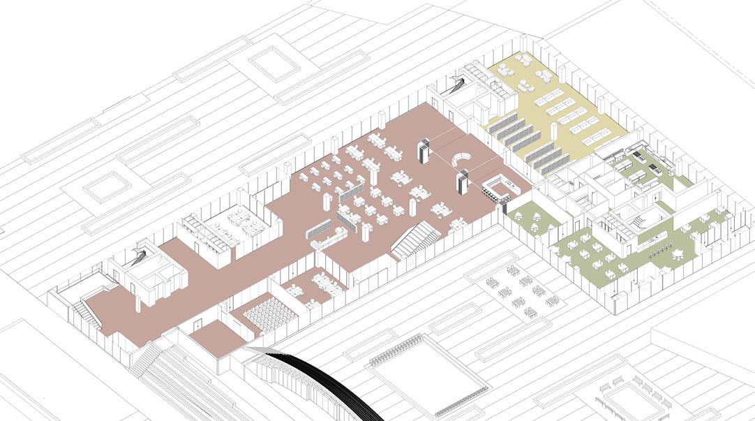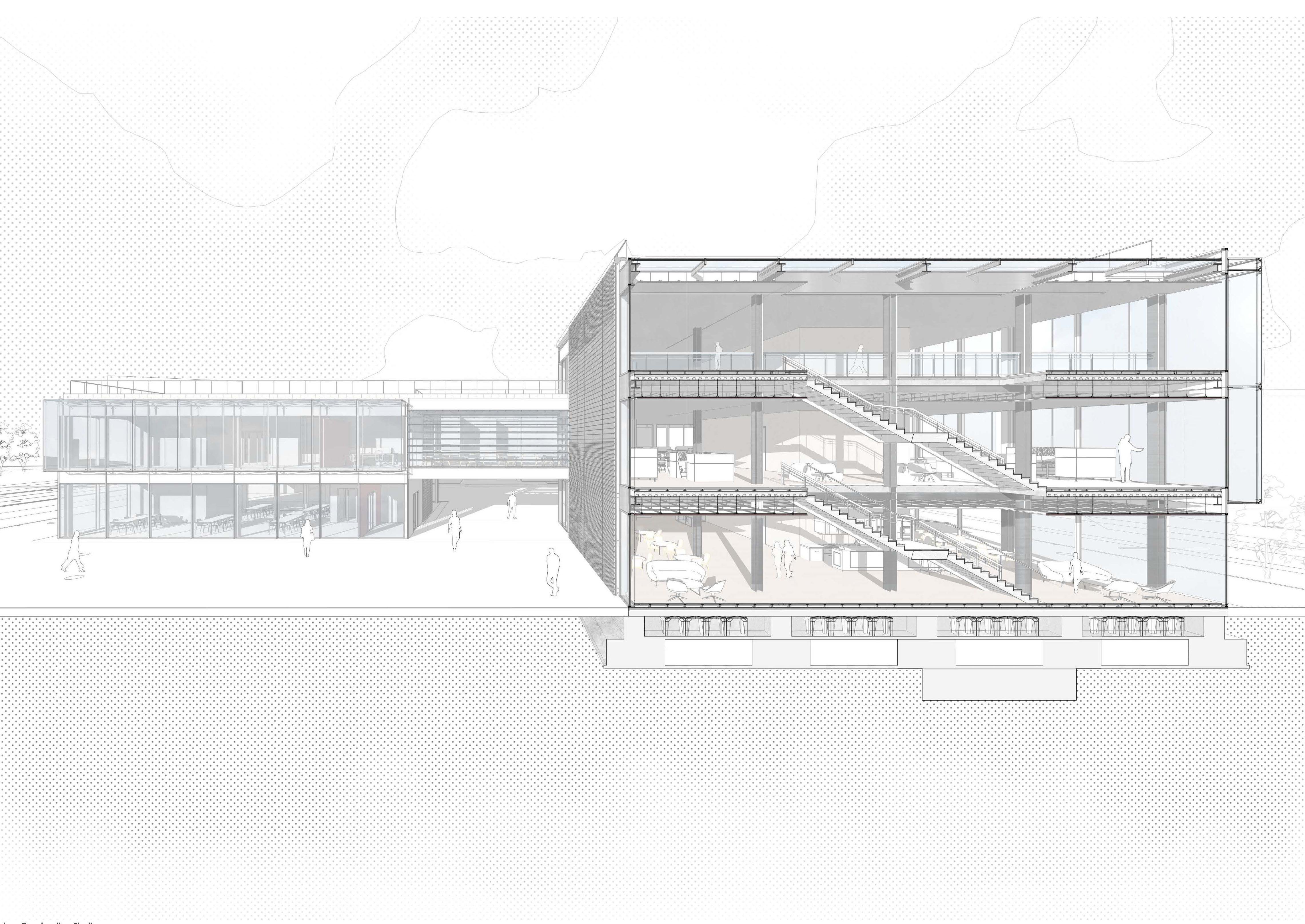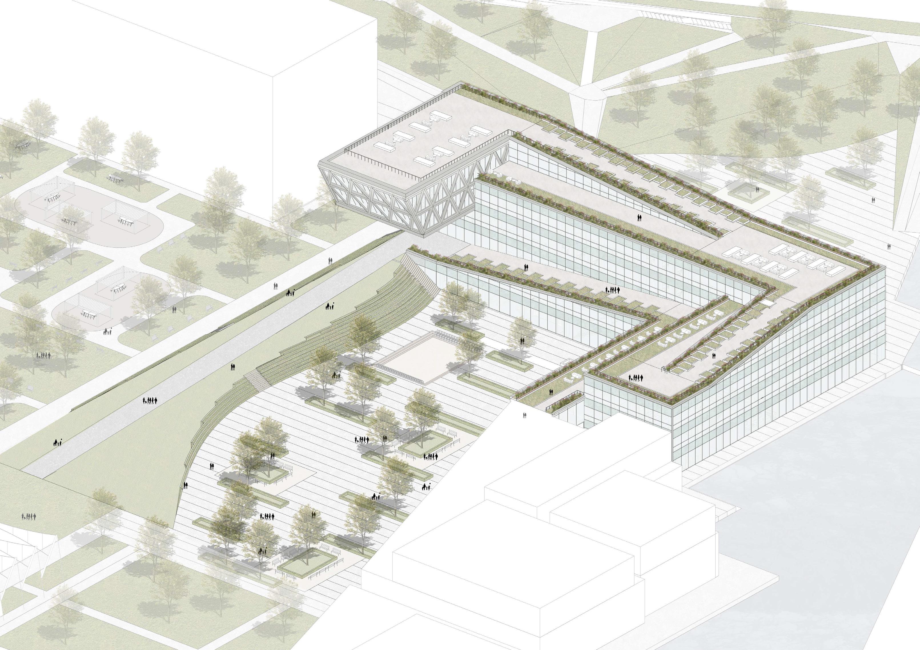 The Milano Innovation District hosted Expo 2015, today a center of knowledge and has established an ecosystem for social and economic development. The MIND’s backbone is called decuma no, a long artery that starts at the western gate and ends at the eastern one, where our project is located as an ending of the artery. Our starting point was to create a proper ending by re vitalizing the area with the green ramp and its master plan that transformed the area surrounding the new university campus into a park dedicated to sports and technology. The strategic location close to the new university and to the existing human technopole gave perfect ground for the development of a center dedicated to the research of natural science. The common ground (ground floor) is conceptualized as a translucent and flexible space, ful ly accessible by the public. In contrast, we designed the labo ratories in the above levels to feature a more enclosed design.