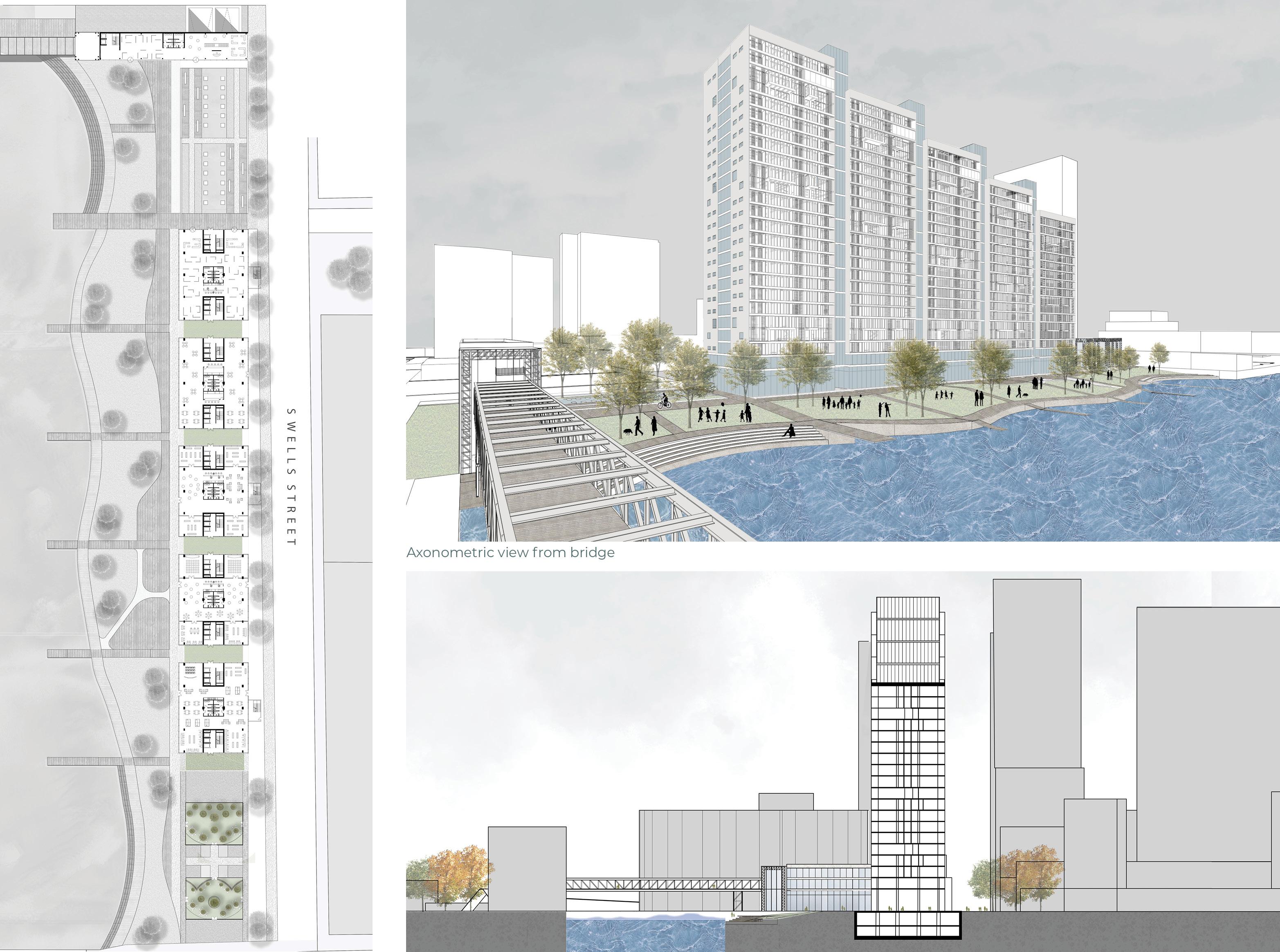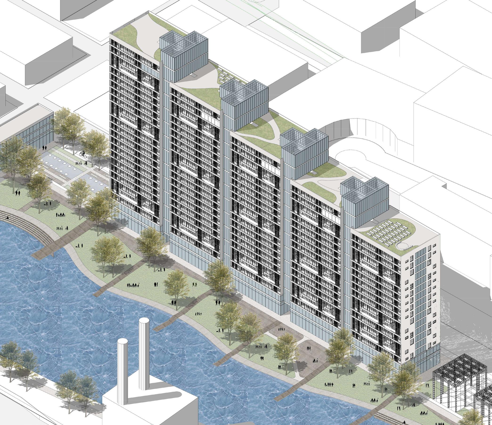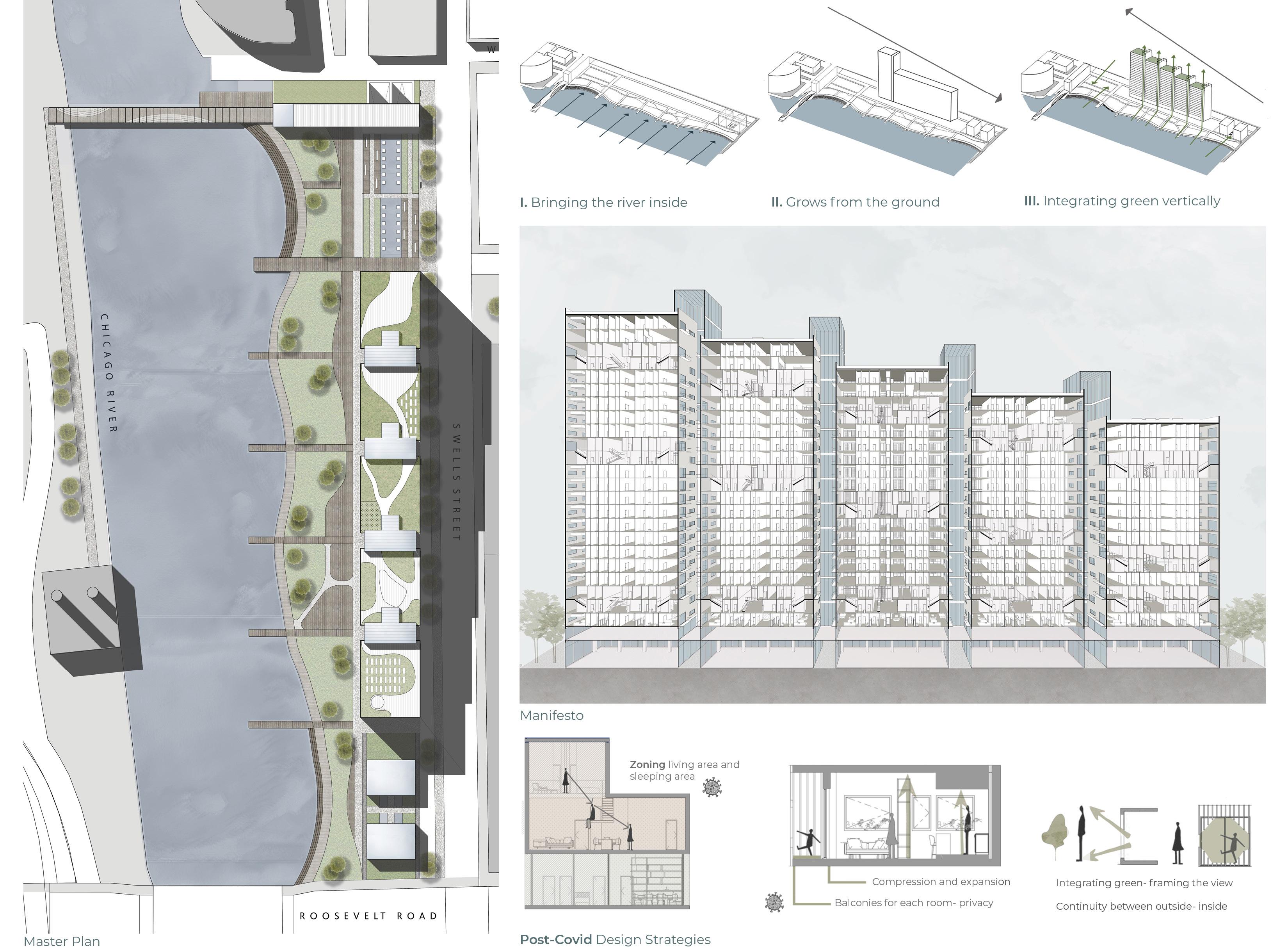 The “Green Falls” project emerges from the study of the urban strategies of Chicago, “Adding green to urban design,” and derives from the study of the urban and built environment of tall buildings in the city. The project, therefore, consists of five housing units connected by green glass galleries and pedestrian bridges between them, which form the main building.