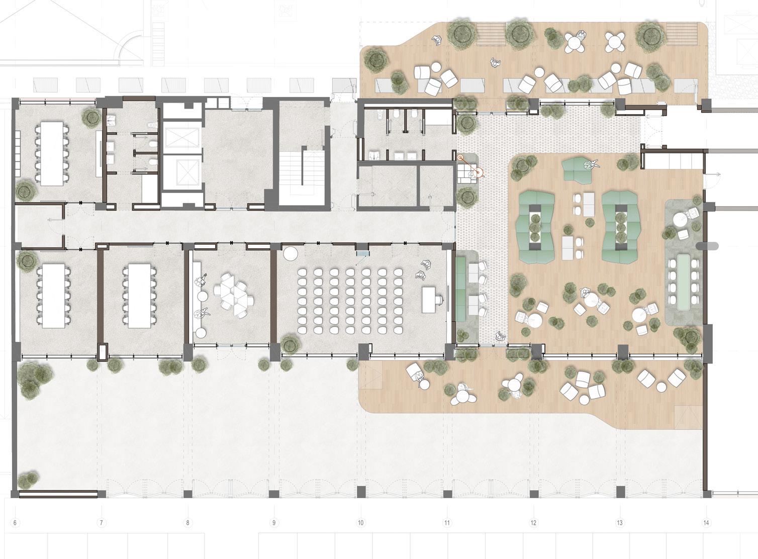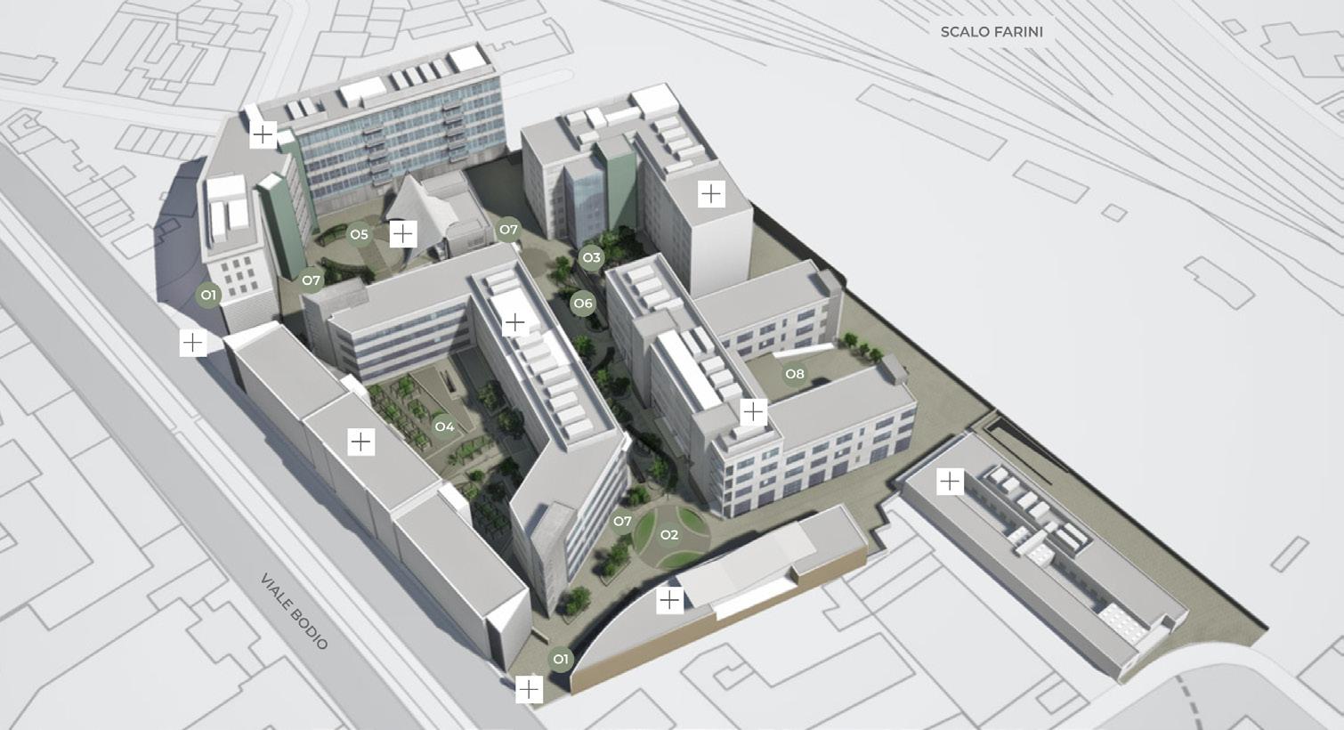 II Prisma has been operating a redevelopment of the project and has generated a new concept for the building complex. The new concept is inspired by regenerative design; Bodio Center creates new harmonies between greenery and architecture with a mosaic of shared gardens.