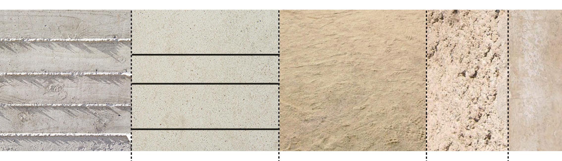 Exposed concrete wall Linear concrete planks Qatari limestone fine gravel Sprayed concrete, Cement base render flat finishing