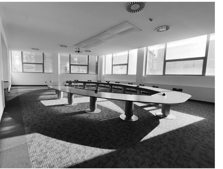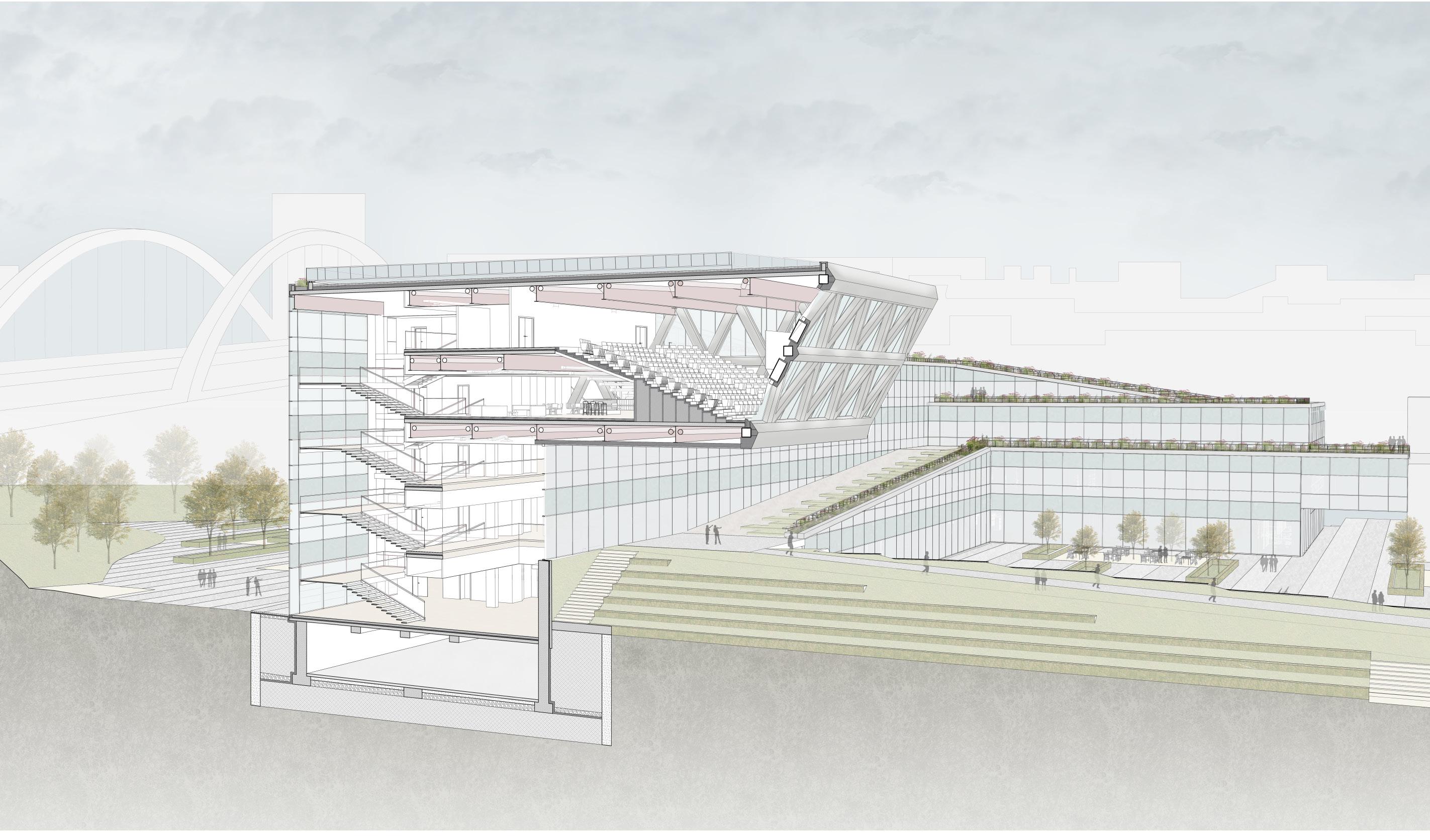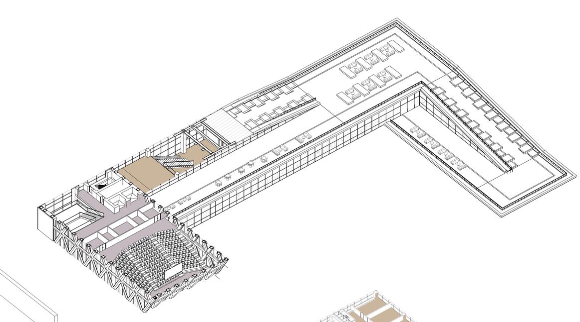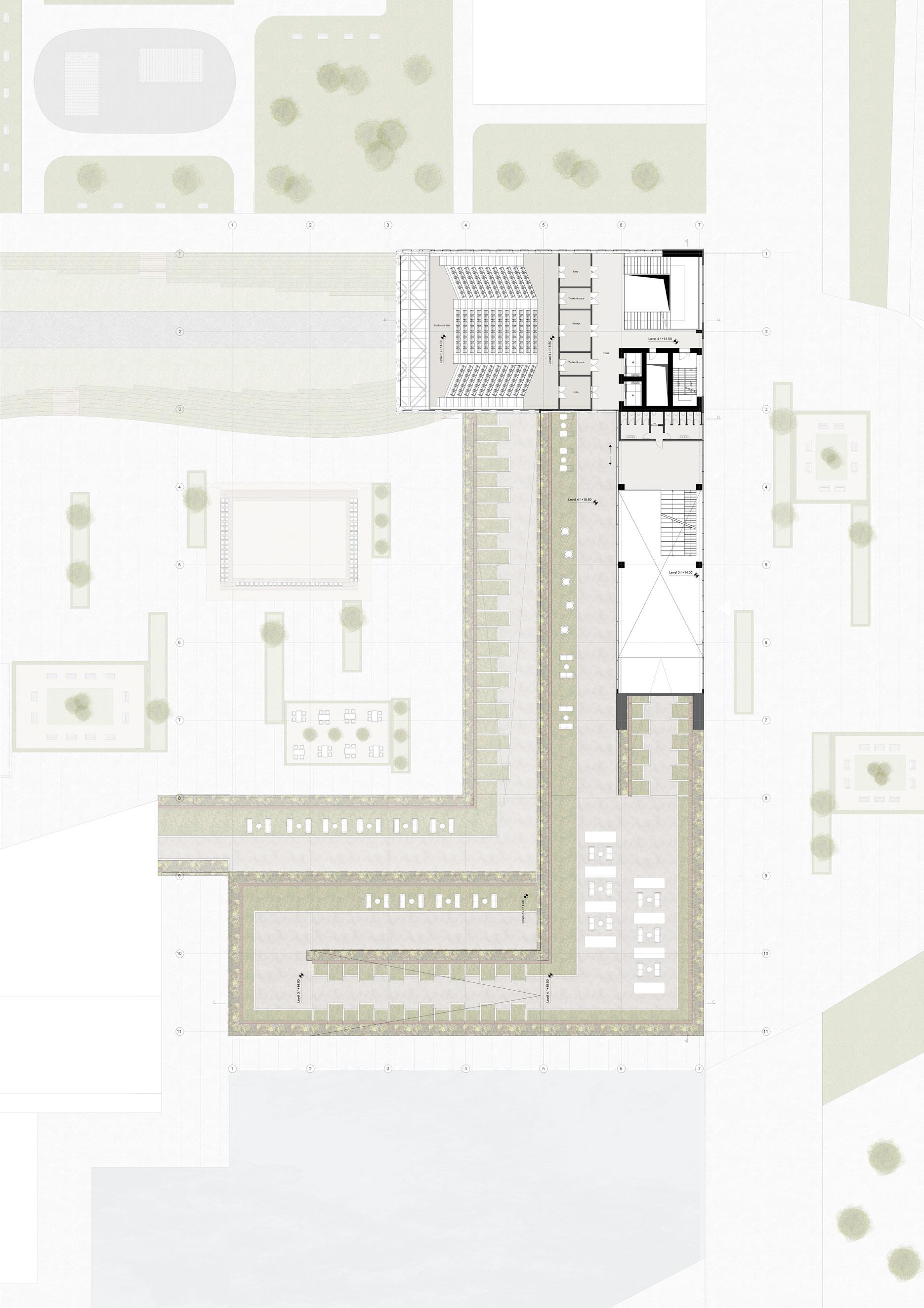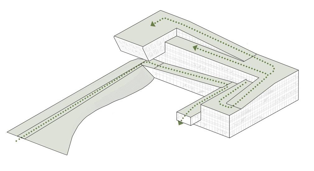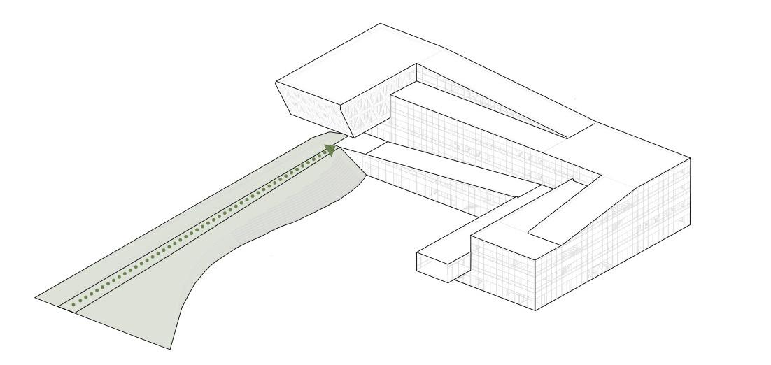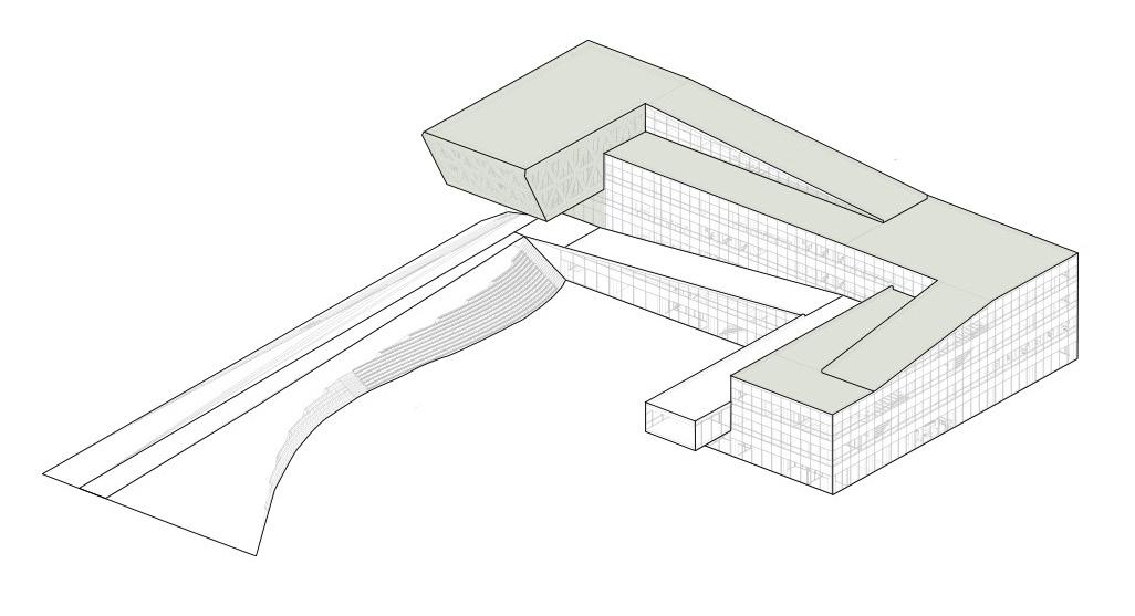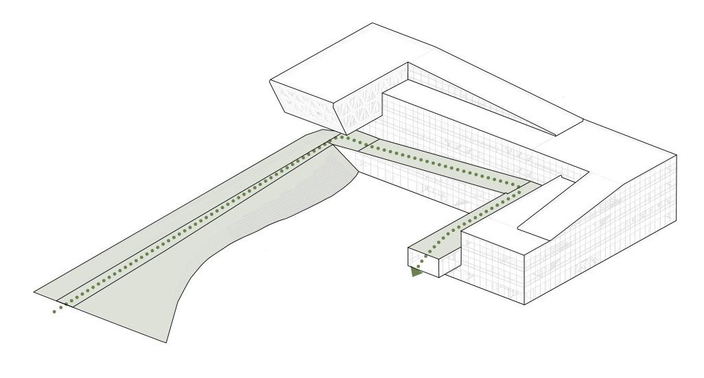The green ramp designed to invite people through the main road and transformed into green terraces, which creates a dynamic at mosphere for the building. From a sustainable point of view, The building is composed of a wooden structure, and it also includes steel and concrete parts that are harmoniously integrated. The cantilever, where the conference hall is placed, emphasizes the entrance of the building and finishes the movement of the ramp.