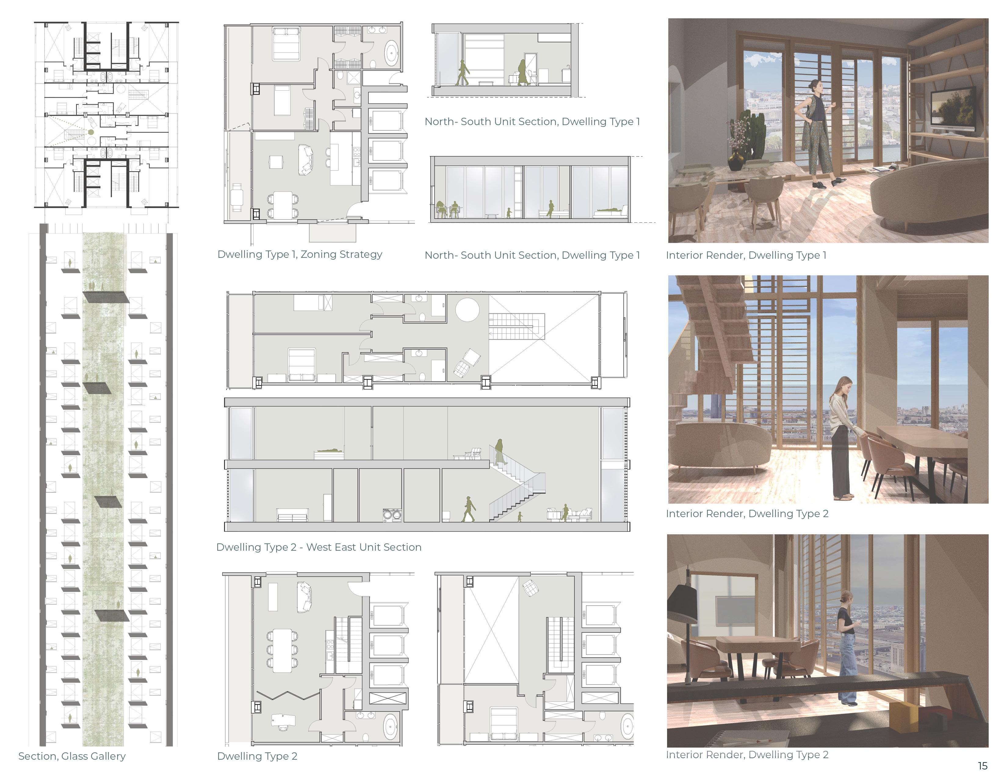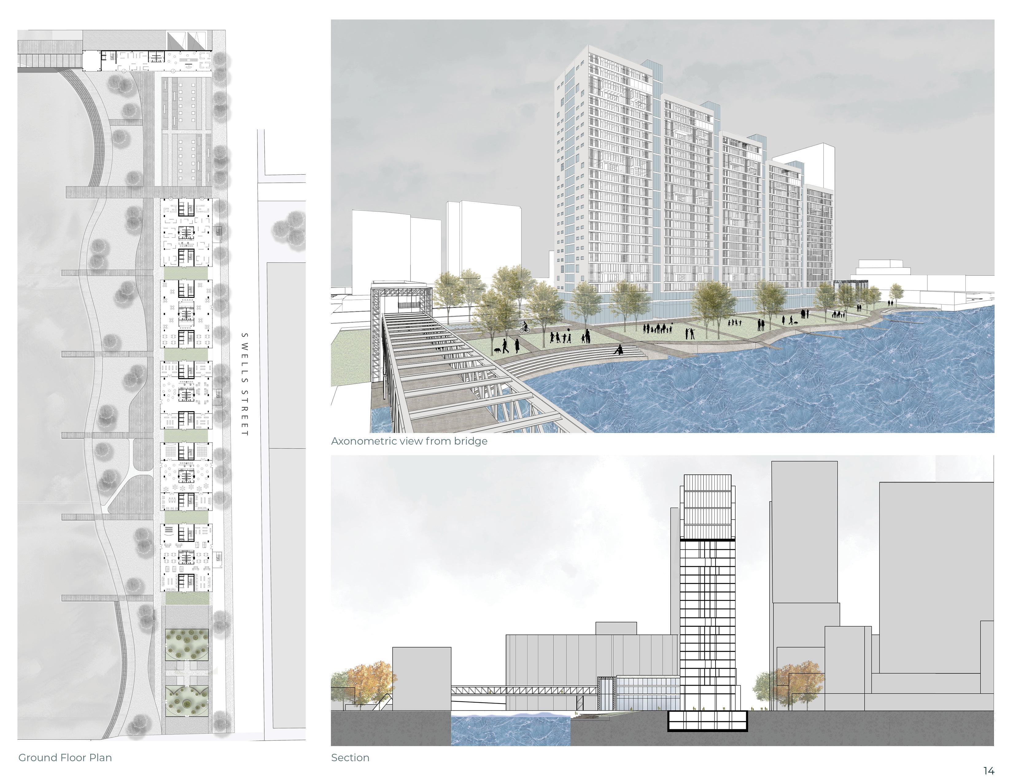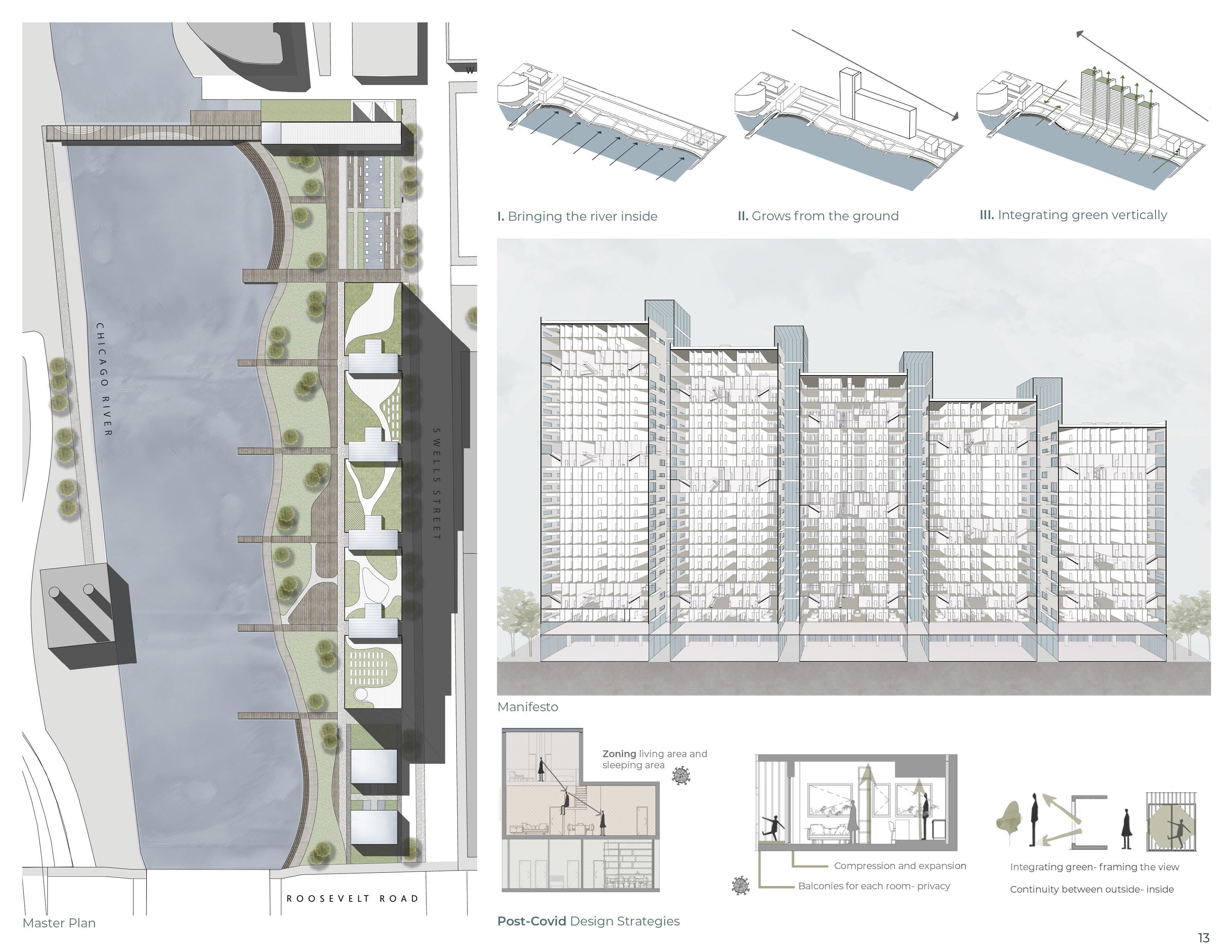 The “Green Falls” project emerges from the study of the urban strategies of Chicago, “Adding green to urban design,” and derives from the study of the urban and built environment of tall buildings in the city. The project, therefore, consists of five housing units connected by green glass galleries and pedestrian bridges between them, which form the main building.