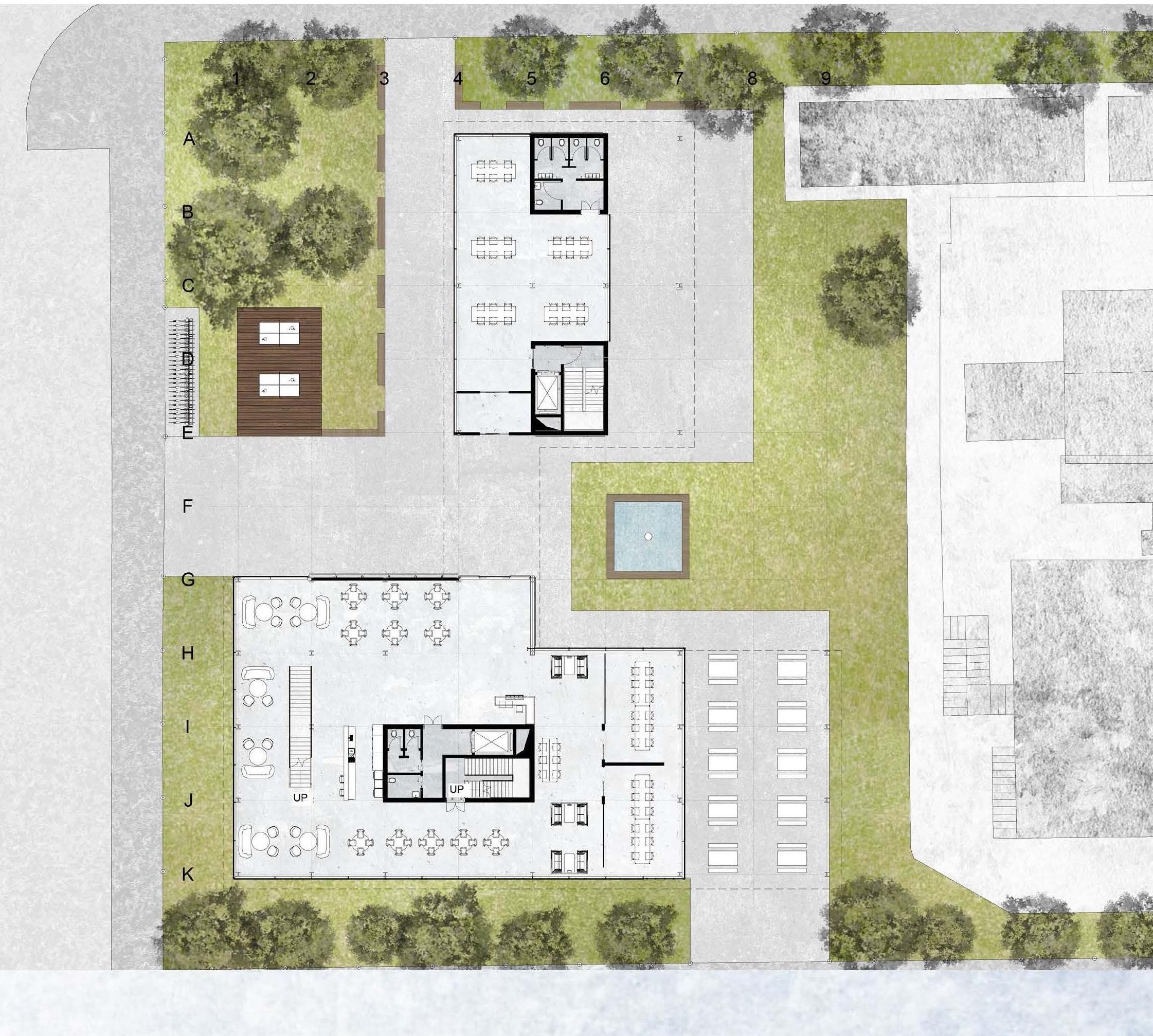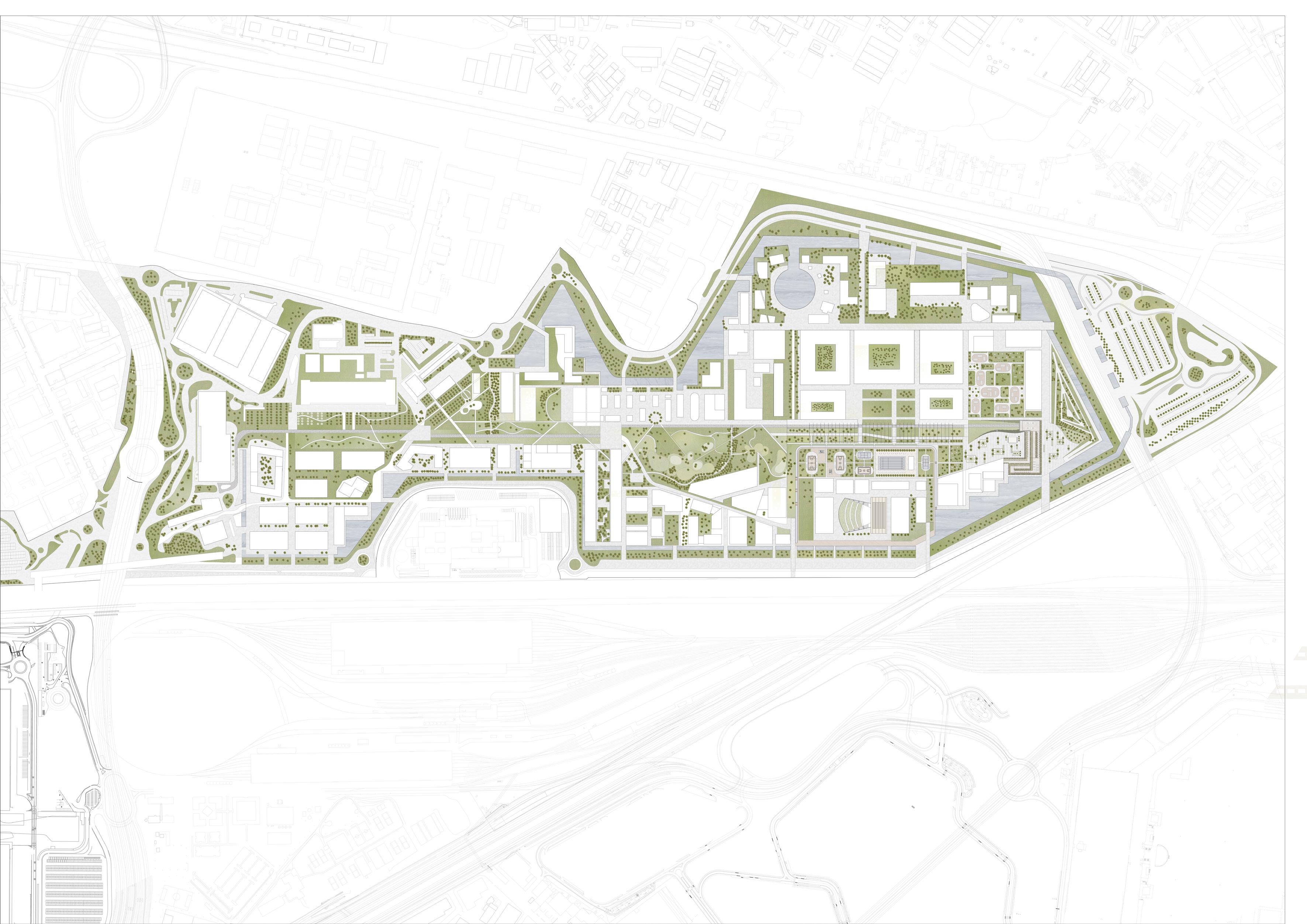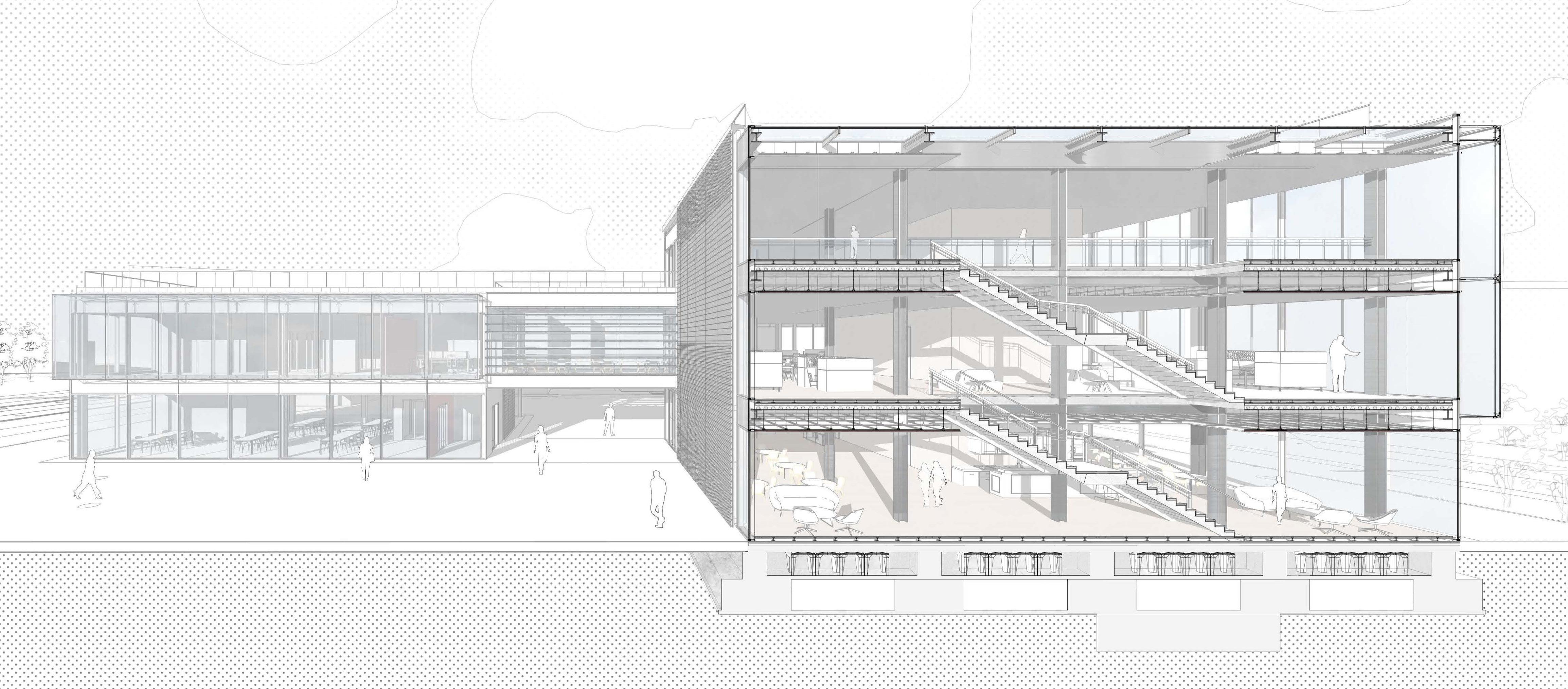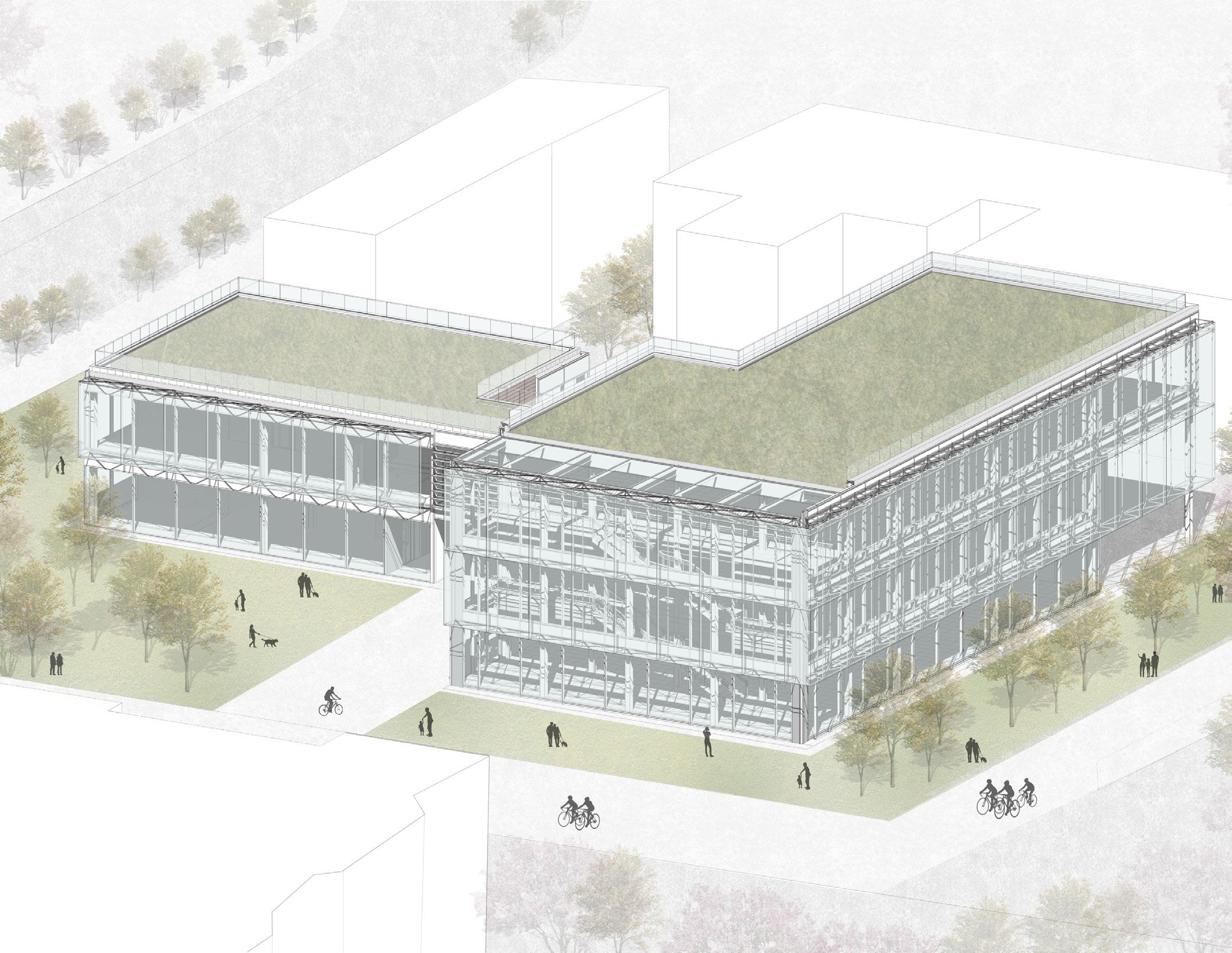 The Milano Innovation District hosted Expo 2015, today a center of knowledge and has established an ecosystem for social and economic development. The MIND’s backbone is called decumano, a long artery that starts at the western gate and ends at the eastern one, where our project is located as an ending of the artery. Our starting point was to create a proper ending by revitalizing the area with the green ramp and its master plan that transformed the area surrounding the new university campus into a park dedicated to sports and technology. The strategic location close to the new university and to the existing human technopole gave perfect ground for the development of a center dedicated to the research of natural science. The common ground (ground floor) is conceptualized as a translucent and flexible space, fully accessible by the public. In contrast, we designed the laboratories in the above levels to feature a more enclosed design.