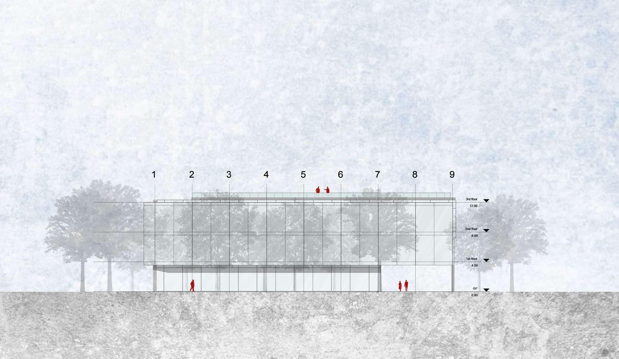 The green ramp designed to invite people through the main road and transformed into green terraces, which creates a dynamic atmosphere for the building. From a sustainable point of view, The building is composed of a wooden structure, and it also includes steel and concrete parts that are harmoniously integrated. The cantilever, where the conference hall is placed, emphasizes the entrance of the building and finishes the movement of the ramp.