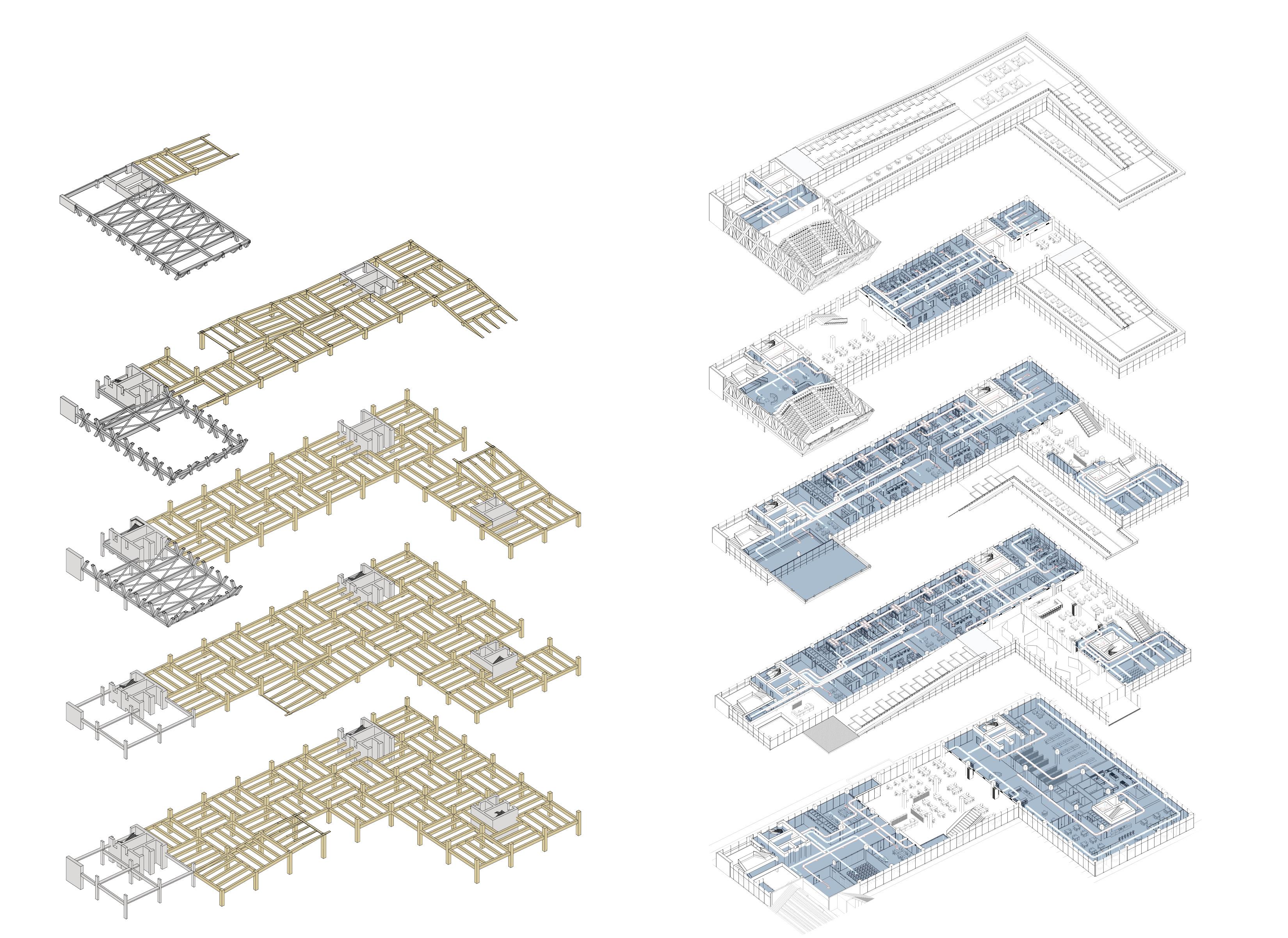 On the concept of growing from the ground, their heights increase from south to north, respecting the sun’s path. Their terraced roofs, creating a concept of green falls, offer residents different green environments with different functions. Dwelling units are designed considering post-pandemic factors such as zoning systems and convertible spaces within the house. In addition to the green roof terraces, two large winter gardens allow residents and the public to meet for educational activities or simply to relax in a forest on an urban scale. Regarding the structure, all buildings are related to each other, and the choice of structural material is steel.