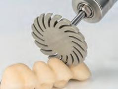 En la preparación de aleaciones NEM que se realiza el laboratorio dental suele haber una mayor abrasión del material por razones técnicas de moldeado. Por ello, se precisan herramientas de trabajo muy fuertes y estas tienen una corta vida útil. Las nuevas aleaciones NEM son algo más blandas, pero sin embargo difíciles de astillar. Para realizar un trabajo rentable económicamente deben utilizarse fresas que sufran un menor desgaste y al mismo tiempo garanticen una elevada abrasión del material. El dentado finode titanio VZ27 recientemente desarrollado, tiene una gran capacidad de corte para una abrasión elevada del material y el alisado de la superficiedel material, de modo que se facilita el proceso de pulido posterior.