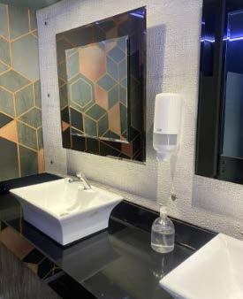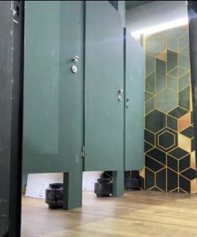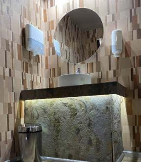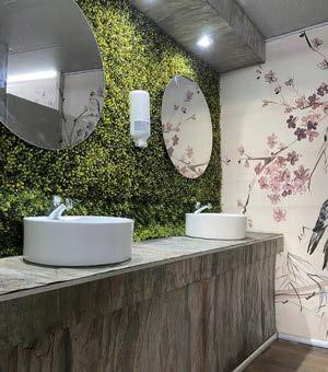 El módulo Gala cuenta con entradas individuales para damas y caballeros, con 4 bachas y 6 inodoros (eléctricos) de porcelana de primeras marcas, decorados y retroiluminados para lograr un ambiente cálido, música funcional, pisos son de madera LG y paredes empapeladas con la colección de Muresco.