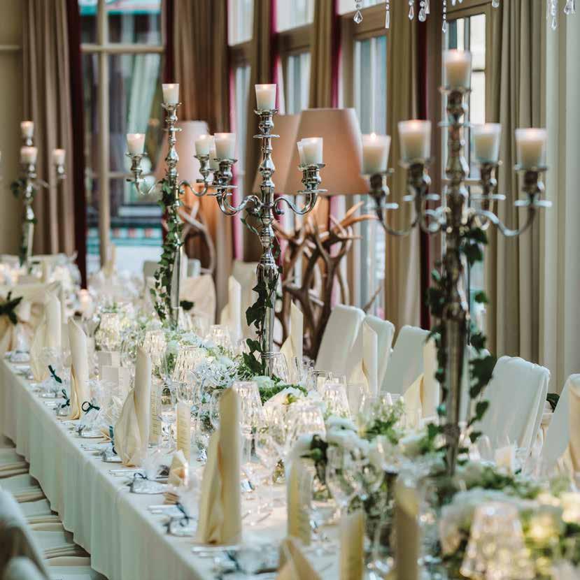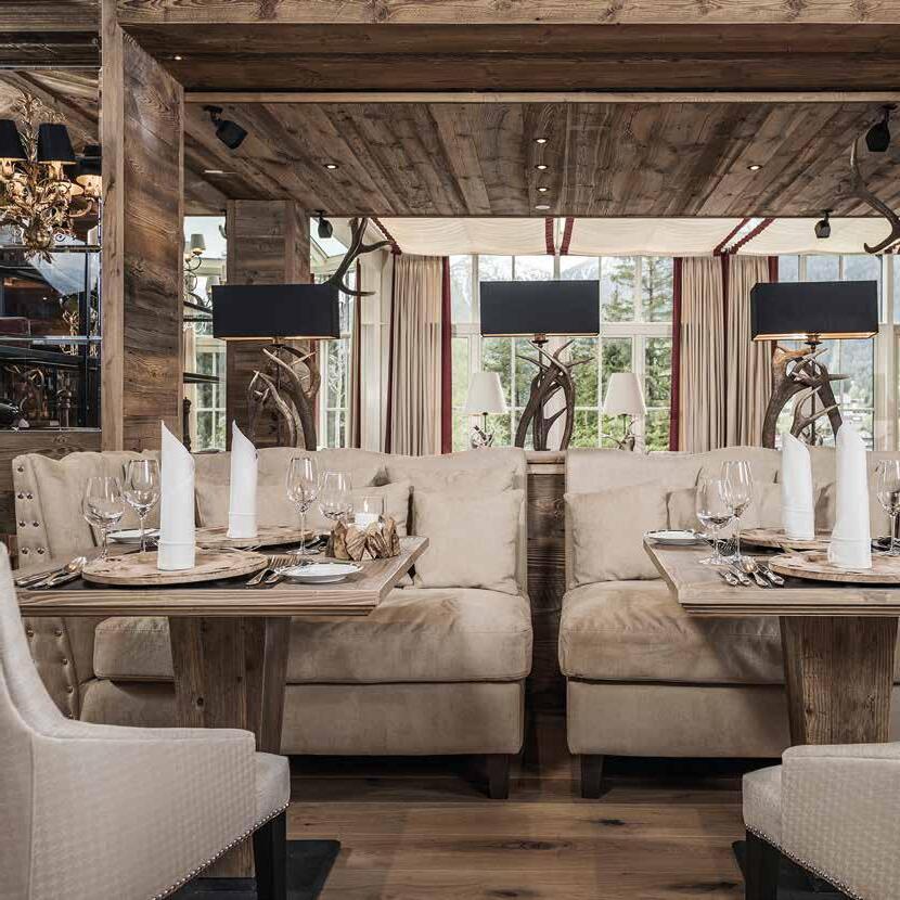 Glanzvolle Salons, meisterhaft komponierte Menüs und ein aufmerksamer Service verleihen jeder Feier unvergleichliche Finesse. Große Panoramafenster rahmen die Tiroler Bergwelt ein und tauchen die Räume in ein sanftes, stimmungsvolles Licht.