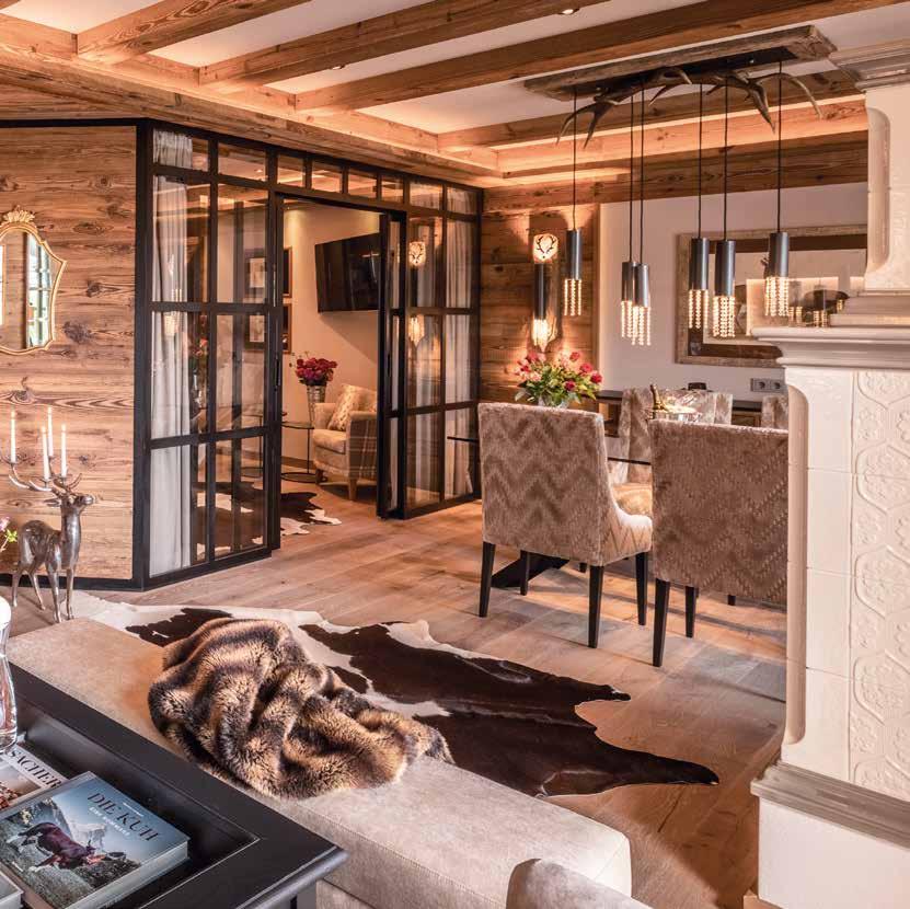 In the refined style of the house, an aesthetic unfolds that embodies timeless, modern Alpine chic in its ultimate perfection – an exquisite fusion of alpine tradition and urban sophistication. The meticulously designed rooms and suites offer a sanctuary of well-being, defined by comfort, spaciousness, and authentic hospitality. Expansive glass fronts bathe the interiors in natural light, while carefully selected materials such as fine wood, loden, and marble create a harmonious atmosphere. State-of-the-art technology seamlessly integrates with the elegant design, enhancing the space with a unique aura of exclusive luxury.