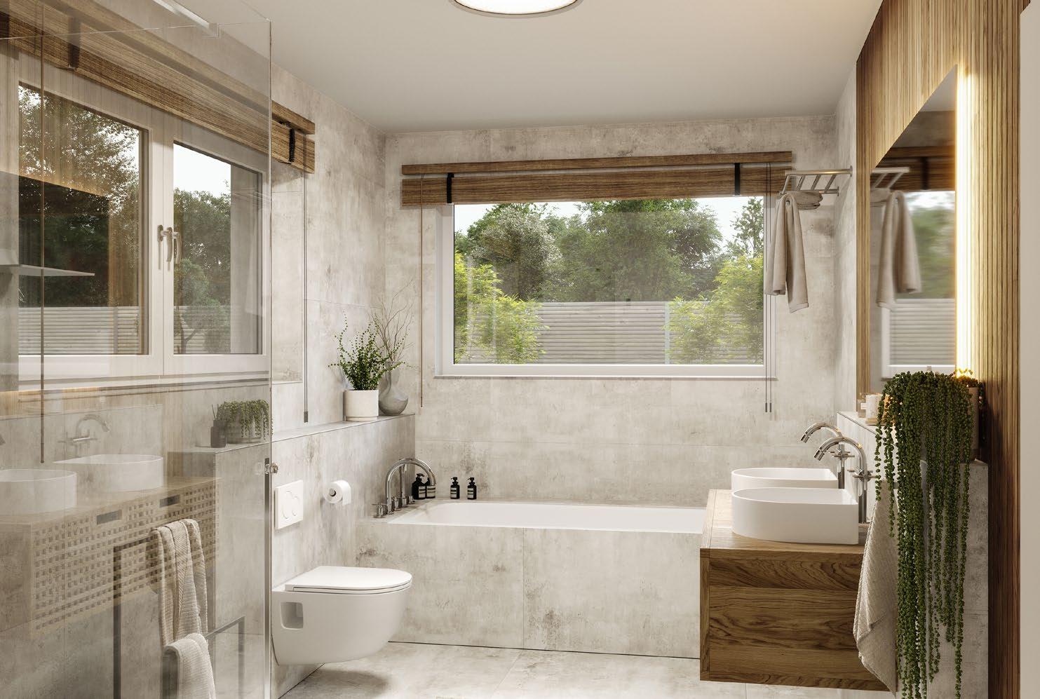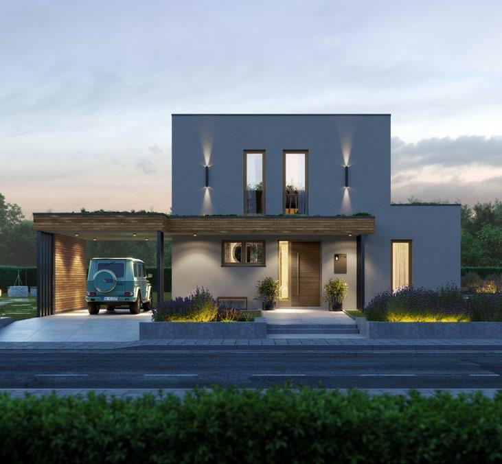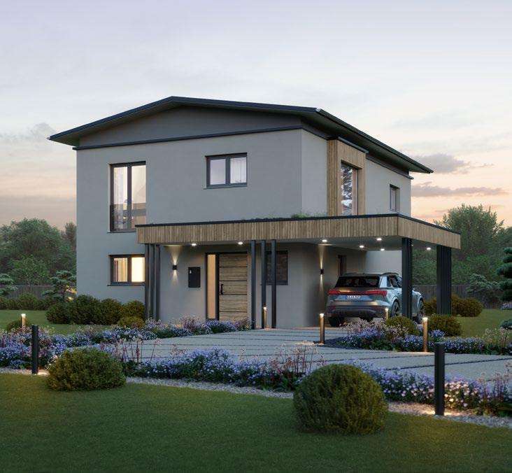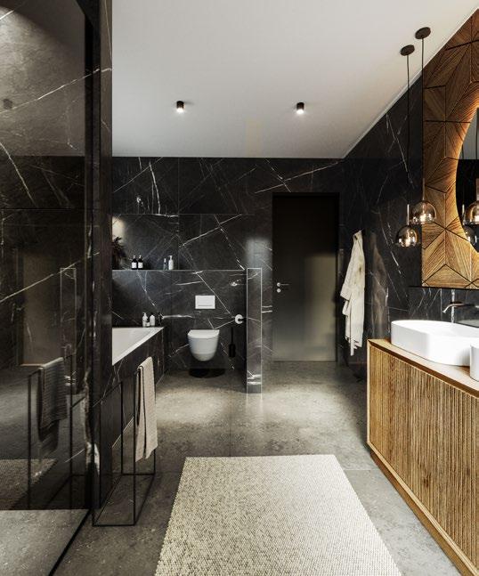 Fensterflächen mit stilvollen Holzelementen zu einer klaren, zeitlosen Optik. Der überdachte Eingangsbereich und der integrierte Carport betonen den exklusiven Charakter des Hauses und sorgen für einen repräsentativen Empfang. Im Inneren entsteht ein harmonisches Zusammenspiel aus Design, Funktionalität und Wohnlichkeit. Das luxuriöse Badezimmer kombiniert edlen schwarzen Marmor mit warmen Holzelementen, hochwertigen Armaturen und einer großzügigen Glasdusche –ein Ort der Ruhe und Erholung. Sanftes Licht und dezente Akzente schaffen eine wohnliche Atmosphäre.