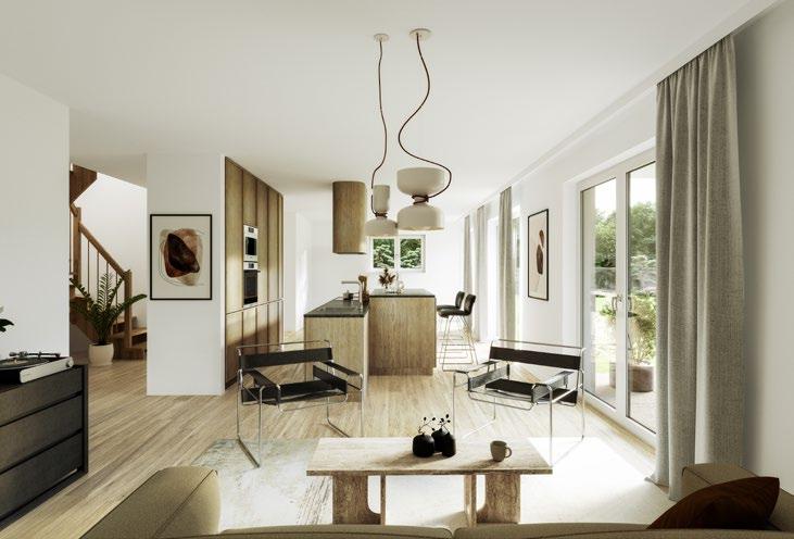 Großzügige Fensterflächen öffnen den Wohnbereich zur Terrasse und dem Garten – dabei wird Licht zum prägenden Element des Hauses. Die klare Architektur und das durchdachte Design verbinden Ästhetik mit Alltagstauglichkeit. Der kompakte Grundriss vereint Komfort und Funktionalität auf überschaubarer Fläche. Die einladende Diele führt in den offen gestalteten Wohn- und Essbereich: ein Ort für entspannte Abende und gesellige Stunden. Die angrenzende Küche mit moderner Kochinsel und integrierter Sitzgelegenheit lädt zu genussvollen Momenten ein – perfekt für den Start in den Tag.
