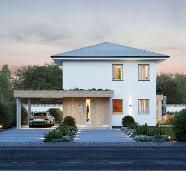 Außen wie innen setzt das Signature L168 auf schlichte Formensprache, hochwertige Materialien und liebevolle Details. Die weiße Putzfassade in Kombination mit warmen Holzelementen und einem grauen Ziegeldach verleiht dem Haus eine ruhige, moderne Ausstrahlung. Der seitlich platzierte Carport integriert sich elegant in das Gesamtkonzept und bietet Platz für zwei Fahrzeuge.