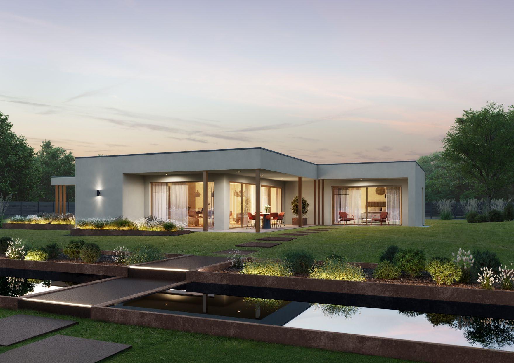 Der Bungalow C138 begeistert durch klare Linien, großzügige Fensterfronten und eine offene, lichtdurchflutete Raumgestaltung. Die Verbindung aus moderner Architektur und funktionaler Planung schafft ein Wohnkonzept, das höchsten Ansprüchen gerecht wird. Der L-förmige Grundriss öffnet sich zu einem geschützten Außenbereich und lässt Innen- und Außenraum harmonisch miteinander verschmelzen. Der weitläufige Wohn-, Ess- und Küchenbereich mit großen Schiebetüren bildet das Herzstück des Hauses – perfekt für entspannte Familienzeit oder gesellige Abende mit Freunden.