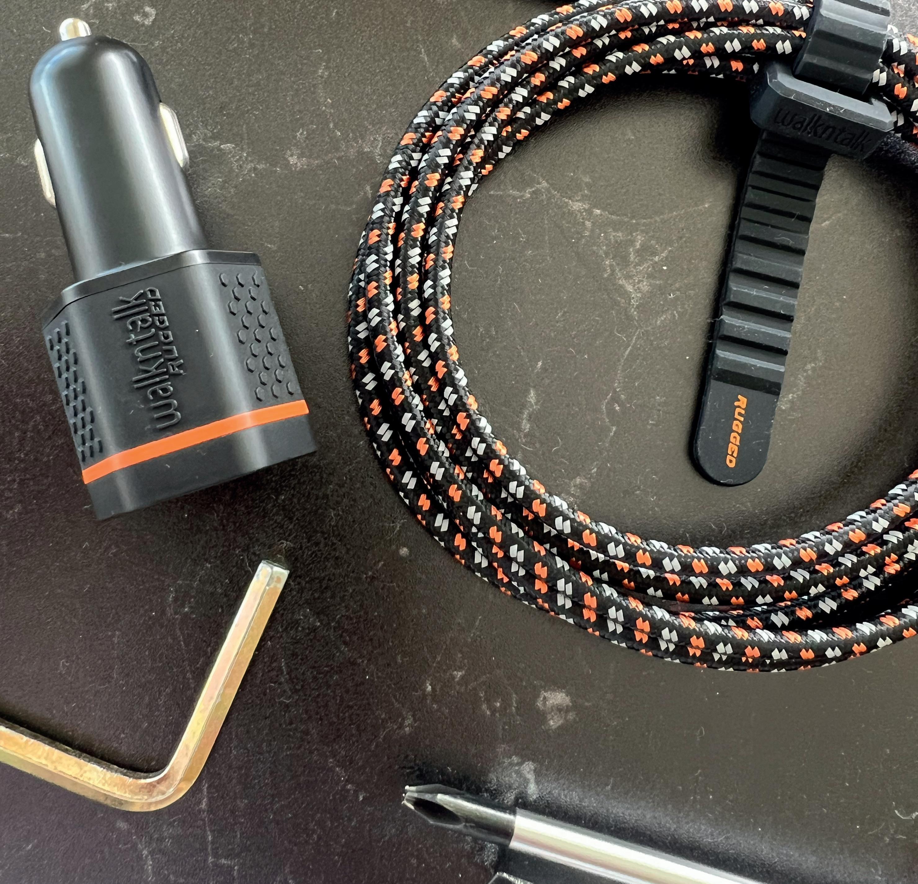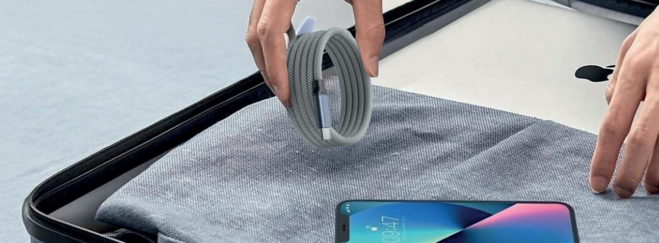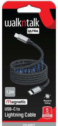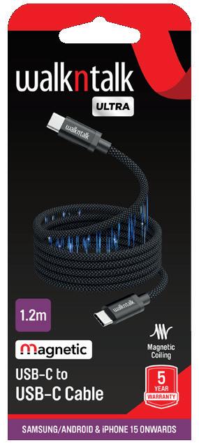 Embedded magnets along the cable’s length snap together to keep it neatly coiled and secure.