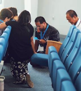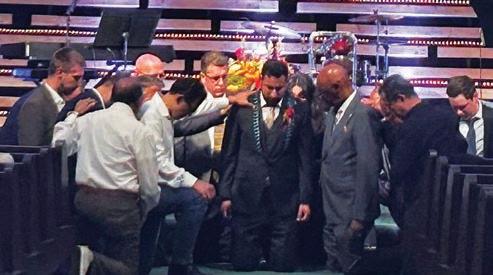 IZQUIERDA: Campos y los candidatos al bautismo se reúnen para los votos unos momentos antes del bautismo. DERECHA: A todos los expastores se les pidió que se unieran a Campos en la plataforma para una oración especial de rededicación por la iglesia y sus miembros, ofrecida por el vicepresidente ejecutivo de SCC, Royal Harrison.