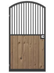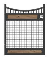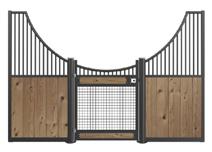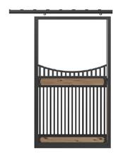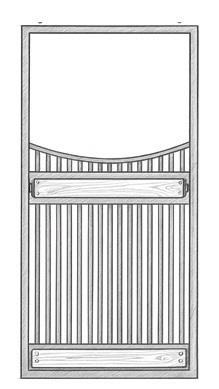 1F Centered Sliding Stall Front Vertical Lumber In-Fill, Euro Arched Yoke, and HMH Door Design (Center Name Plate, Mesh, and Shavings Guard on Door).