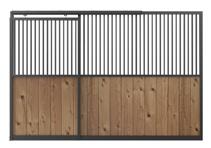 1G Centered Sliding Stall Front Vertical Lumber In-Fill., HGH Door Design (Center Name Plate, 1" Grills, and Shavings Guard on Door). Grilled Feed Door.