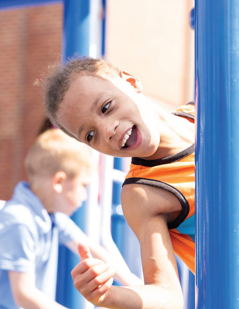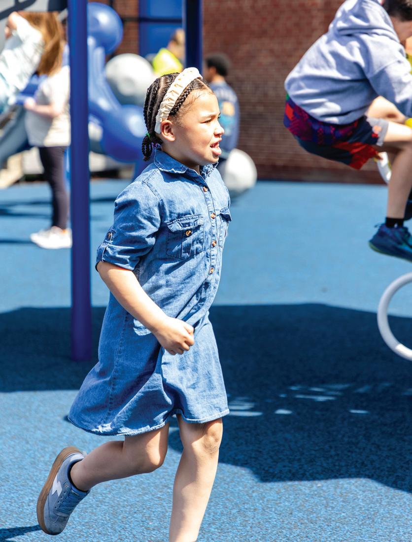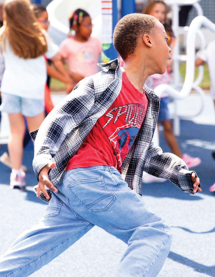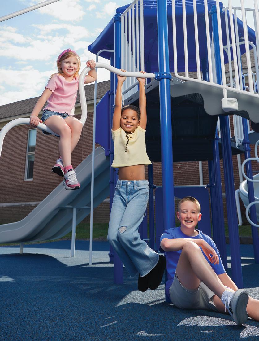 With the K-2 playground on hold due to the foundation grant, the committee shifted gears and broke ground on an entirely new play space for the third through fifth students. “We started at nothing and we fully funded that playground without any grants, just with the help of donors and sponsors. Now, the older kids have their own play space, but we preserved green space too, so that they have room to run and still support other activities,” Natalie proudly shared. In short, the PTO fully designed and paid for the 3-5 playground inclusive of the pour-inplace foundation through the help of local community partners and parent support. No small feat! This space is already well-loved by the students as it provides them with ample room to romp and play in all sorts of different and creative ways, but still gives them equipment to climb and crawl on. It’s easy to think that the older students don’t need as much in the way of physical engagement, but the specialized and intentional appliances in the 3-5 playground have their growth and development front and center.