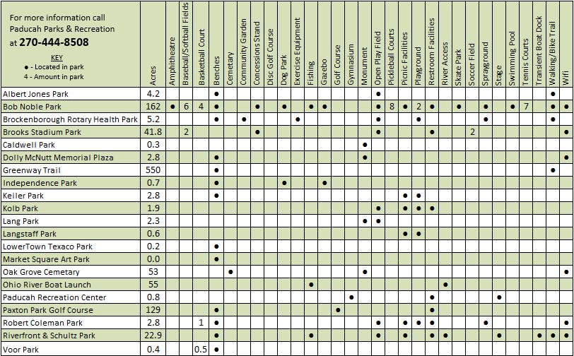 Paducah Parks & Recreation invites the public to use the public parks, playgrounds, and recreational areas Paducah has more than two dozen parks and facilities for the public to enjoy. Some of the park shelters and facilities can be reserved for private use.